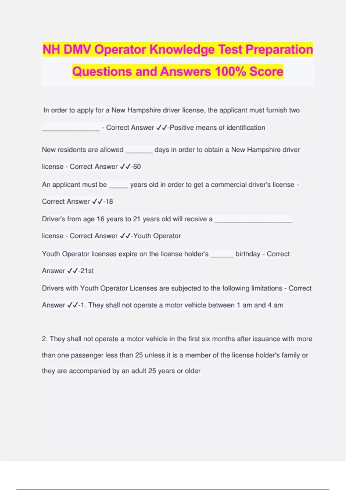 NH DMV Operator Knowledge Test Preparation Questions and Answers 100% Score In order to apply for a New Hampshire driver license, the applicant must furnish two _______________ - Correct Answer ️️ -Positive means of identification New residents are allowed _______ days in order to obtain a New Hampshire driver license - Correct Answer ️️ -60 An applicant must be _____ years old in order to get a commercial driver's license - Correct Answer ️️ -18 Driver's from age 16 years to 21 years old will receive a ____________________ license - Correct Answer ️️ -Youth Operator Youth Operator licenses expire on the license holder's ______ birthday - Correct Answer ️️ -21st Drivers with Youth Operator Licenses are subjected to the following limitations - Correct Answer ️️ -1. They shall not operate a motor vehicle between 1 am and 4 am 2. They shall not operate a motor vehicle in the first six months after issuance with more than one passenger less than 25 unless it is a member of the license holder's family or they are accompanied by an adult 25 years or older 3. Shall not operate a motor vehicle with more passengers than available safety restraints In order to practice driving a youth must _________ - Correct Answer ️️ -Be 15 and 1/2 years of age, carry proof of age, and be accompanied by a parent of legal guardian age 25 or older An applicant bring what to their driving test? - Correct Answer ️️ -1. Any driver's licenses issued by other states 2. Two forms of positive identification 3. A legally registered, inspected, and safe vehicle 4. A person to drive the applicant to and from the testing site An applicant will not receive their new license until they ___________ any out of state licenses - Correct Answer ️️ -Surrender In order to pass the vision test, an applicant must be able to read _________________ lines in both eyes - Correct Answer ️️ -20/40 In order to pass the vision test, applicants who are blind in one eye, must be able to read _____ lines - Correct Answer ️️ -20/30 If an applicant passes the test, they will receive their permanent license within ____ days. This is also the valid period of their temporary license. - Correct Answer ️️ -60 Class D - Operator allows the operator to drive a vehicle that is less than ___________ pounds if not towing a trailer with a weight of over _________ pounds, or driving a vehicle intended for ___ persons, including the driver. - Correct Answer ️️ -26,000 10,000 15 A motor-driven cycle allows you to operate an motorcycle, moped, motor scooter, or bicycle with no more than ___ horsepower - Correct Answer ️️ -5 A vehicle can be operated as a moped if it _______ - Correct Answer ️️ -1. Does not require the driver to shift gears 2. Does not have more than 2 horsepower or 50cc 3. Cannot go faster than 30 mph on ground level An operator with the following licenses can operate a moped - Correct Ans