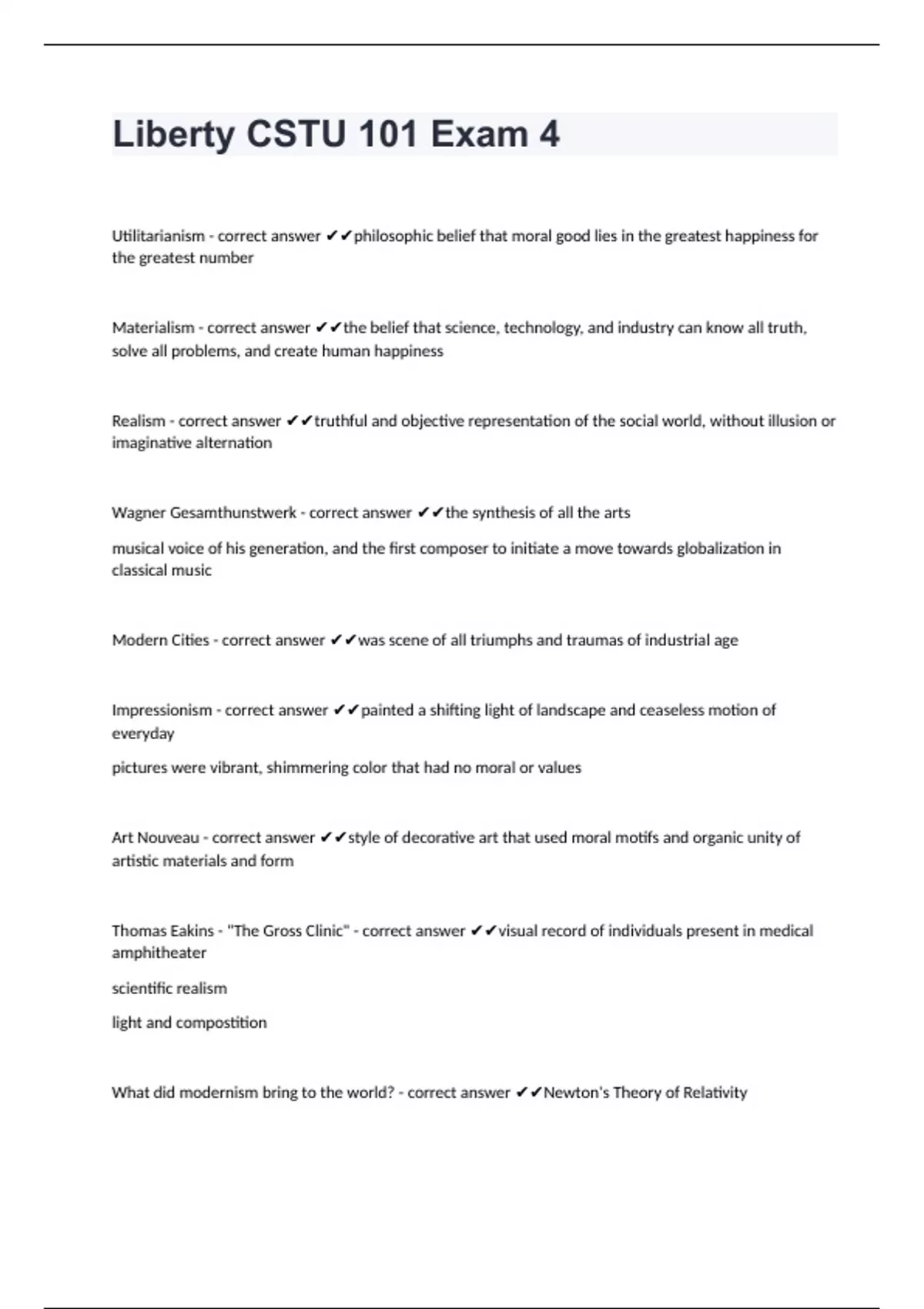Liberty CSTU 101 Exam 4Utilitarianism - correct answer philosophic belief that moral good lies in the greatest happiness for the greatest number Materialism - correct answer the belief that science, technology, and industry can know all truth, solve all problems, and create human happiness Realism - correct answer truthful and objective representation of the social world, without illusion or imaginative alternation Wagner Gesamthunstwerk - correct answer the synthesis of all the arts musical voice of his generation, and the first composer to initiate a move towards globalization in classical music Modern Cities - correct answer was scene of all triumphs and traumas of industrial age Impressionism - correct answer painted a shifting light of landscape and ceaseless motion of everyday pictures were vibrant, shimmering color that had no moral or values Art Nouveau - correct answer style of decorative art that used moral motifs and organic unity of artistic materials and form Thomas Eakins - "The Gross Clinic" - correct answer visual record of individuals present in medical amphitheater scientific realism light and compostition