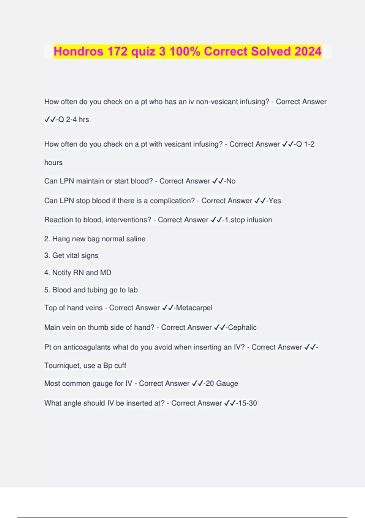Hondros 172 quiz 3 100% Correct Solved 2024 How often do you check on a pt who has an iv non-vesicant infusing? - Correct Answer ️️ -Q 2-4 hrs How often do you check on a pt with vesicant infusing? - Correct Answer ️️ -Q 1-2 hours Can LPN maintain or start blood? - Correct Answer ️️ -No Can LPN stop blood if there is a complication? - Correct Answer ️️ -Yes Reaction to blood, interventions? - Correct Answer ️️ - infusion 2. Hang new bag normal saline 3. Get vital signs 4. Notify RN and MD 5. Blood and tubing go to lab Top of hand veins - Correct Answer ️️ -Metacarpel Main vein on thumb side of hand? - Correct Answer ️️ -Cephalic Pt on anticoagulants what do you avoid when inserting an IV? - Correct Answer ️️ - Tourniquet, use a Bp cuff Most common gauge for IV - Correct Answer ️️ -20 Gauge What angle should IV be inserted at? - Correct Answer ️️ -15-30 How many times can a nurse or nurses try an IV - Correct Answer ️️ -2 nurses can each try 2x times Overdose of PCA symptoms - Correct Answer ️️ -Less than 10 respiration's Decreased pulse ox Lethargy Change in Level of conscience Respiratory depression Universal blood donor - Correct Answer ️️ -O negative Universal blood recipient - Correct Answer ️️ -AB positive Infiltration symptoms - Correct Answer ️️ -Skin is cool at IV