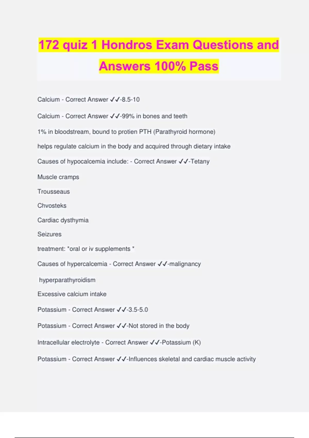 172 quiz 1 Hondros Exam Questions and Answers 100% Pass Calcium - Correct Answer ️️ -8.5-10 Calcium - Correct Answer ️️ -99% in bones and teeth 1% in bloodstream, bound to protien PTH (Parathyroid hormone) helps regulate calcium in the body and acquired through dietary intake Causes of hypocalcemia include: - Correct Answer ️️ -Tetany Muscle cramps Trousseaus Chvosteks Cardiac dysthymia Seizures treatment: *oral or iv supplements * Causes of hypercalcemia - Correct Answer ️️ -malignancy hyperparathyroidism Excessive calcium intake Potassium - Correct Answer ️️ -3.5-5.0 Potassium - Correct Answer ️️ -Not stored in the body Intracellular electrolyte - Correct Answer ️️ -Potassium (K) Potassium - Correct Answer ️️ -Influences skeletal and cardiac muscle activity Hypokalemia causes - Correct Answer ️️ -GI loss Renal loss Diuretics Increased perspiration's NG suctioning, vomiting, diuretics, laxatives Excessive use of glucocorticoid Poor dietary intake Hypokalemia symptoms - Correct Answer ️️ -Fatigue Muscle cramps ABG's may show metabolic alkalosis Anorexia nausea and vomiting Increased sensitivity to digoxin ECG changes: ventricular tachycardia and ventricular fibrillation Hypokalemia Treatment/Interventions - Correct Answer ️️ -Mild loss increases per diet request Salt supplements For low potassium levels cardiac monitoring is important Potassium IV must not be given IVP the heart will stop IV Potassium is irritating to the veins and causes phlebitis fluid volume deficit causes - Correct Answer ️️ -Vomiting, diarrhea, burns Hemorrhage Drainage NG suctions, fistulas, tubes Insensible loss: diaphoresis, fever, tachypnea Not enough fluid intake Third space fluid shift NPO status Diabetes insipidus Fluid Volume Deficit (FVD) symptoms - Correct Answer ️
