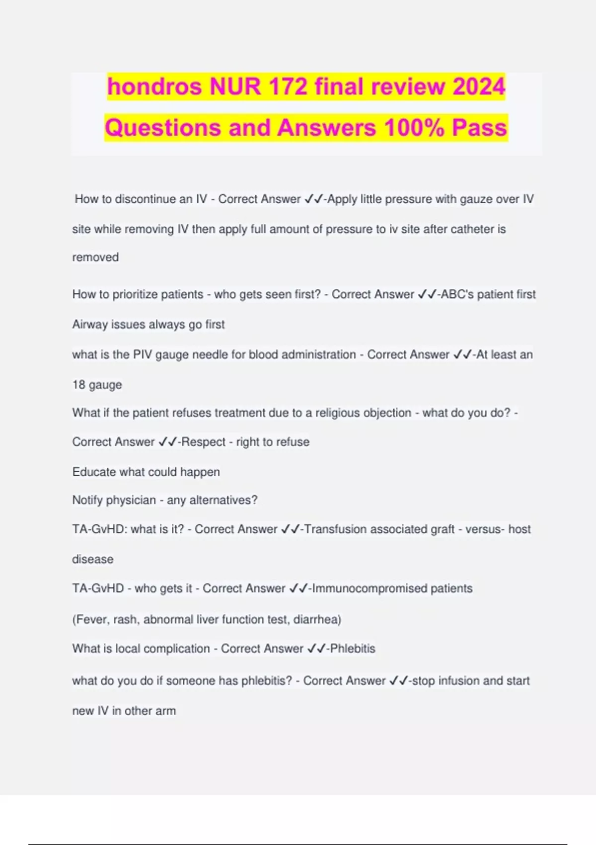 hondros NUR 172 final review 2024 Questions and Answers 100% Pass How to discontinue an IV - Correct Answer ️️ -Apply little pressure with gauze over IV site while removing IV then apply full amount of pressure to iv site after catheter is removed How to prioritize patients - who gets seen first? - Correct Answer ️️ -ABC's patient first Airway issues always go first what is the PIV gauge needle for blood administration - Correct Answer ️️ -At least an 18 gauge What if the patient refuses treatment due to a religious objection - what do you do? - Correct Answer ️️ -Respect - right to refuse Educate what could happen Notify physician - any alternatives? TA-GvHD: what is it? - Correct Answer ️️ -Transfusion associated graft - versus- host disease TA-GvHD - who gets it - Correct Answer ️️ -Immunocompromised patients (Fever, rash, abnormal liver function test, diarrhea) What is local complication - Correct Answer ️️ -Phlebitis what do you do if someone has phlebitis? - Correct Answer ️️ -stop infusion and start new IV in other arm signs of phlebitis as complication of IV therapy - Correct Answer ️️ -Will have a Palpable cord Red line along with vein What to do if output is greater than intake - Correct Answer ️️ -Dehydrated: might need IV fluids What to do if intake is greater than output - Correct Answer ️️ -diuretic What to watch for when administering 25% albumin (hypertonic) - Correct Answer ️️ - Fluid volume overload what is AHTR - Correct Answer ️️ -Acute hemolytic transfusion reaction Acute hemolytic transfusion reaction - Correct Answer ️️ -Fever Tachycardia Drop in BP Red urine (break down of RBC) Sudden back pain types of isotonic solutions - Correct Answer ️️ -0.9 - trauma (hemorrhaging) D5W LR - burn patients Lactated Ringer's Solution (LR) - Correct Answer ️️ -LR AKA Hartmann's solution contains dextrose and e-lytes must check compatibility Fluid stays in vascular space can Increase BP types of Hypotonic solutions - Correct Answer ️️ -½ N