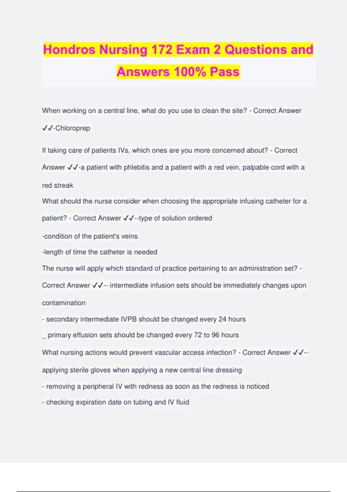 Hondros Nursing 172 Exam 2 Questions and Answers 100% Pass When working on a central line, what do you use to clean the site? - Correct Answer ️️ -Chloroprep If taking care of patients IVs, which ones are you more concerned about? - Correct Answer ️️ -a patient with phlebitis and a patient with a red vein, palpable cord with a red streak What should the nurse consider when choosing the appropriate infusing catheter for a patient? - Correct Answer ️️ --type of solution ordered -condition of the patient's veins -length of time the catheter is needed The nurse will apply which standard of practice pertaining to an administration set? - Correct Answer ️️ -- intermediate infusion sets should be immediately changes upon contamination - secondary intermediate IVPB should be changed every 24 hours _ primary effusion sets should be changed every 72 to 96 hours What nursing actions would prevent vascular access infection? - Correct Answer ️️ -- applying sterile gloves when applying a new central line dressing - removing a peripheral IV with redness as soon as the redness is noticed - checking expiration date on tubing and IV fluid The nurse knows that local complications are which of the following? - Correct Answer ️️ -- Phlebitis - Hematoma - extravasation What are the reasons that you as a nurse are concerned with preventing healthcare acquired infections? - Correct Answer ️️ -- healthcare institutions are often not reimbursed for hospital acquired infections - can be life threatening - there is a NPSG concerning infection prevention What actions will the nurse take to prevent infiltration/extravasation? - Correct Answer ️️ -- instruct the patient to immediately report pain, burning, or swelling at the IV site - do not attempt a peripheral IV more that two times per nurse - do not place a peripheral IV over a joint How does Chloroprep dry? - Correct Answer ️️ -air dry- DO NOT FAN OR BLOW DRY If a patient had jugular vein distention, difficulty breathing, 3-lb weight gain in 24 hours, and generalized edema, what nursing interventions would you carry out in the state of Ohio as an LPN? - Correct Answer ️️ -- daily weights - restrict oral intake - position patient in semi-fowlers - check lunch sounds for crackles What action would show an understanding by the LPN of a sterile technique? - Correct Answer ️️ -- the LPN only touches sterile objects to other sterile objects - the LPN takes care to make sure that sterile hands do not drop below the waist - the LPN avoids touching outside the one-inch border of the sterile field The patient has just had a hip fracture and has a history of CHF; which of these are risk for complications associated with the patients IV site? - Correct Answer ️️ -- immunity to infection generally declines with age placing Mrs. Livingston at a high-risk for infection - Mrs. Livingston is at an increased risk for infiltration or extravasation injury because geriatric patients typically have more fragile veins - have a fragile vein and being an elderly patient increase Mrs. Livingstons risk for phlebitis A newly admitted 50 y/o has severe bacterial pneumonia, has a pulse ox is 88%, and has had a mastectomy on her right side one year ago. What orders or interventions will the LPN in Ohio expect to carry out? - Correct Answer ️️ -- monitor continuous pulse ox readings - hang an IVPB antibiotic that works with several kinds of bacteria until the culture and sensitivity results come back - apply oxygen and give a nebulizer treatment as ordered What can the LPN safely delegate to a UAP? - Correct Answer ️️ -- monitor vital signs every four hours on a stable patient - apply non-prescription barrier cream to a fine rash on the patients back - notify the LPN that the IV pump is alarming An LPN is caring for a 15 y/o in a small town in Ohio. What interventions could you as the LPN carryout if the patient has nausea, vomiting, and diarrhea for t