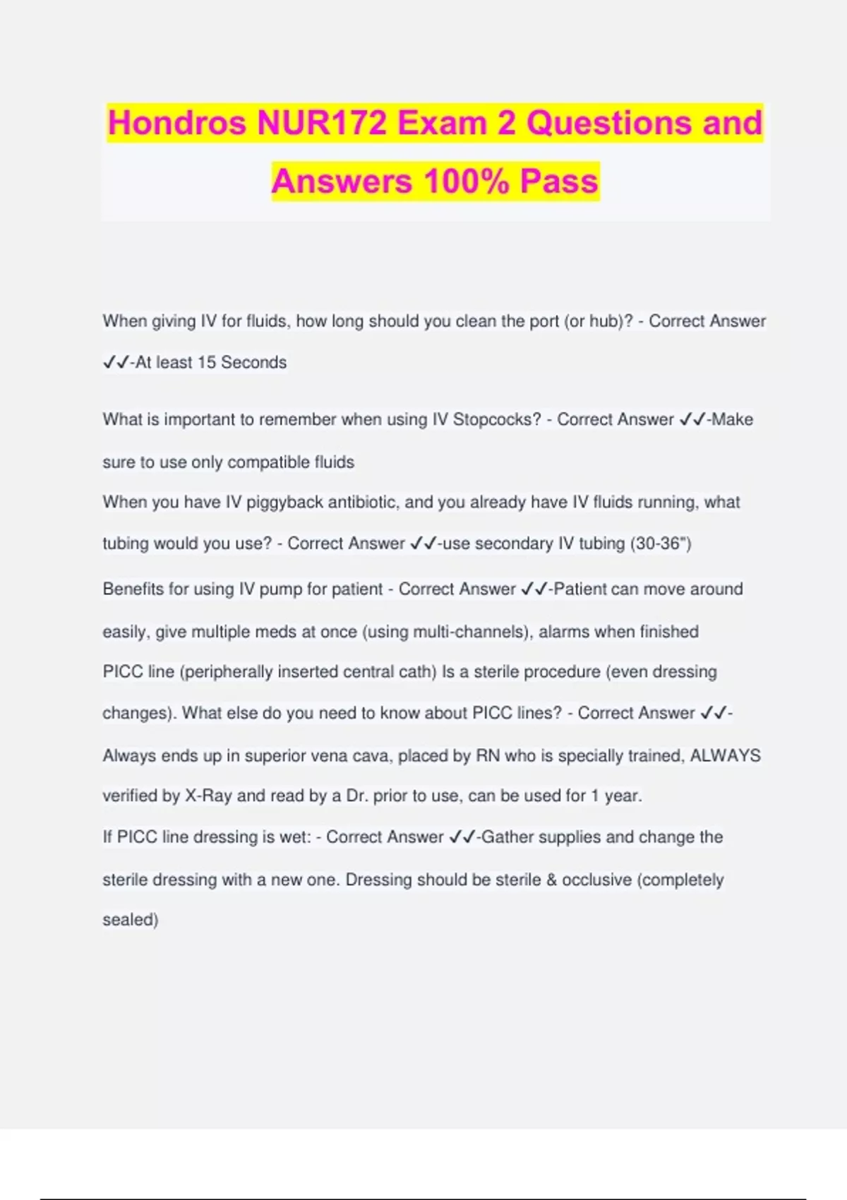 Hondros NUR172 Exam 2 Questions and Answers 100% Pass When giving IV for fluids, how long should you clean the port (or hub)? - Correct Answer ️️ -At least 15 Seconds What is important to remember when using IV Stopcocks? - Correct Answer ️️ -Make sure to use only compatible fluids When you have IV piggyback antibiotic, and you already have IV fluids running, what tubing would you use? - Correct Answer ️️ -use secondary IV tubing (30-36") Benefits for using IV pump for patient - Correct Answer ️️ -Patient can move around easily, give multiple meds at once (using multi-channels), alarms when finished PICC line (peripherally inserted central cath) Is a sterile procedure (even dressing changes). What else do you need to know about PICC lines? - Correct Answer ️️ - Always ends up in superior vena cava, placed by RN who is specially trained, ALWAYS verified by X-Ray and read by a Dr. prior to use, can be used for 1 year. If PICC line dressing is wet: - Correct Answer ️️ -Gather supplies and change the sterile dressing with a new one. Dressing should be sterile & occlusive (completely sealed) Why do we use a Biopatch- circular patch that encloses the PICC line (blue side up-blue to the sky)? - Correct Answer ️️ -This helps dressing from having to be changed so often. REEDA - Correct Answer ️️ -Iv is red, swollen, and warm- remove IV (save do not throw out) Infiltration - Correct Answer ️️ -Site is cool, taut, edema is present Vanco infusing- you suspect leaking into tissue. What is the first thing you should do? - Correct Answer ️️ -Stop the infusion If you suspect bloodstream infusion, list the steps you should take. - Correct Answer ️️ -Report S&S to Dr., anticipate culture, save IV cath, antibiotics, fluids, and give O2. What do you do if you have a patient and you suspect an air embolism? - Correct Answer ️️ -Turn patient on left lateral Trendelenburg until you can get MD. Why is an IV a source of infection? - Correct Answer ️️ -It is an open wound in skin, goes directly into bloodstream. Is insertion is sterile? - Correct Answer ️️ -No, it's Aseptic Name the diagnosis for cough, dyspnea, restlessness, and crackles. - Correct Answer ️️ -Pulmonary edema What would you do if you suspect a patient has infiltration? - Correct Answer ️️ -going to chart assessment of site, include date and time, notify MD, what treatment ordered, what you did for it (what MD ordered), how patient tolerated. Name the diagnosis for red, raised veins - Correct Answer ️️ -Phlebitis What PPE would you wear for a patient with MERSA? - Correct Answer ️️ -Gown and gloves If you are sending someone home with PICC line, what is imp