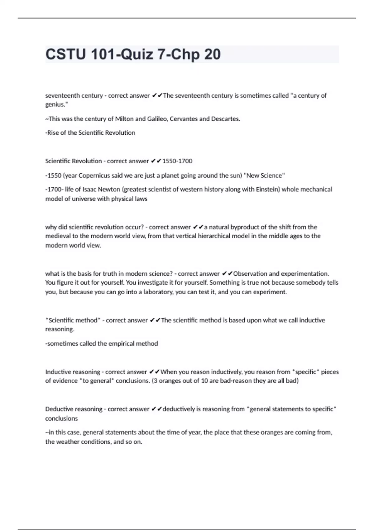 CSTU 101-Quiz 7-Chp 20 seventeenth century - correct answer The seventeenth century is sometimes called "a century of genius." ~This was the century of Milton and Galileo, Cervantes and Descartes. -Rise of the Scientific Revolution Scientific Revolution - correct answer -1550 (year Copernicus said we are just a planet going around the sun) "New Science" -1700- life of Isaac Newton (greatest scientist of western history along with Einstein) whole mechanical model of universe with physical laws why did scientific revolution occur? - correct answer a natural byproduct of the shift from the medieval to the modern world view, from that vertical hierarchical model in the middle ages to the modern world view. what is the basis for truth in modern science? - correct answer Observation and experimentation. You figure it out for yourself. You investigate it for yourself. Something is true not because somebody tells you, but because you can go into a laboratory, you can test it, and you can experiment. *Scientific method* - correct answer The scientific method is based upon what we call inductive reasoning. -sometimes called the empirical method Inductive reasoning - correct answer When you reason inductively, you reason from *specific* pieces of evidence *to general* conclusions. (3 oranges out of 10 are bad-reason they are all bad) Deductive reasoning - correct answer deductively is reasoning from *general statements to specific* conclusions ~in this case, general statements about the time of year, the place that these oranges are coming from, the weather conditions, and so on.