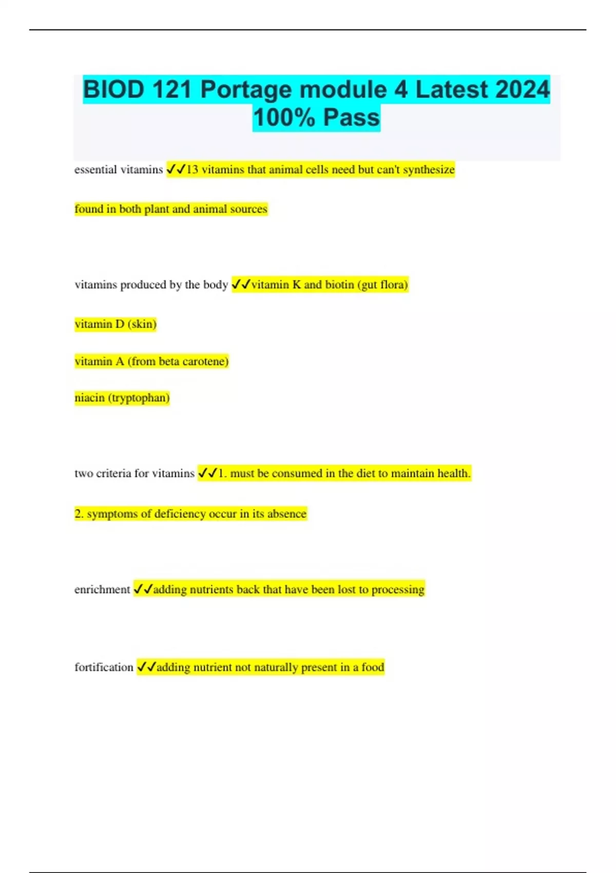 essential vitamins 13 vitamins that animal cells need but can't synthesize found in both plant and animal sources vitamins produced by the body vitamin K and biotin (gut flora) vitamin D (skin) vitamin A (from beta carotene) niacin (tryptophan) two criteria for vitamins 1. must be consumed in the diet to maintain health. 2. symptoms of deficiency occur in its absence enrichment adding nutrients back that have been lost to processing fortification adding nutrient not naturally present in a foodFat soluble vitamins Vitamins A, D, E, K stored in liver and adipose tissue excess consumption could lead to toxic levels two forms of vitamin a 1. Preformed Vitamin A (retinol/retinal), found in foods and animal products: liver, fish, fish oils, fortified milk, yogurt, and eggs 2. Provitamin A or Carotene, the pigment in yellow, orange, and deep green fruits or vegetables vitamin A functions Vision skin and epithelial health growth, development, reproduction disease prevention two forms of vitamin D D2 (ergocalciferol, synthetic) and D3 (cholecalciferol) produced skin > liver > kidney