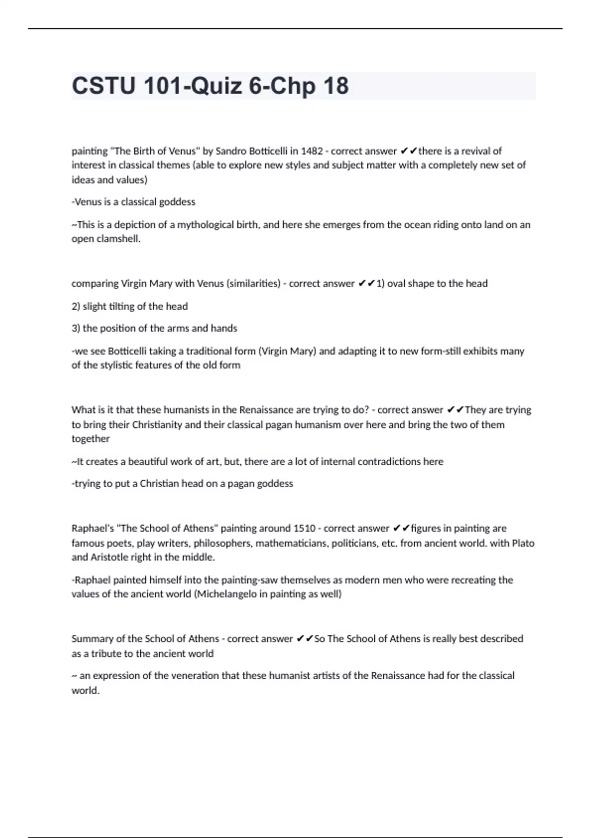 CSTU 101-Quiz 6-Chp 18painting "The Birth of Venus" by Sandro Botticelli in 1482 - correct answer there is a revival of interest in classical themes (able to explore new styles and subject matter with a completely new set of ideas and values) -Venus is a classical goddess ~This is a depiction of a mythological birth, and here she emerges from the ocean riding onto land on an open clamshell. comparing Virgin Mary with Venus (similarities) - correct answer 1) oval shape to the head 2) slight tilting of the head 3) the position of the arms and hands -we see Botticelli taking a traditional form (Virgin Mary) and adapting it to new form-still exhibits many of the stylistic features of the old form What is it that these humanists in the Renaissance are trying to do? - correct answer They are trying to bring their Christianity and their classical pagan humanism over here and bring the two of them together ~It creates a beautiful work of art, but, there are a lot of internal contradictions here -trying to put a Christian head on a pagan goddess Raphael's "The School of Athens" painting around 1510 - correct answer figures in painting are famous poets, play writers, philosophers, mathematicians, politicians, etc. from ancient world. with Plato and Aristotle right in the middle. -Raphael painted himself into the painting-saw themselves as modern men who were recreating the values of the ancient world (Michelangelo in painting as well) Summary of the School of Athens - correct answer So The School of Athens is really best described as a tribute to the ancient world ~ an expression of the veneration that these humanist artists of the Renaissance had for the classical world.