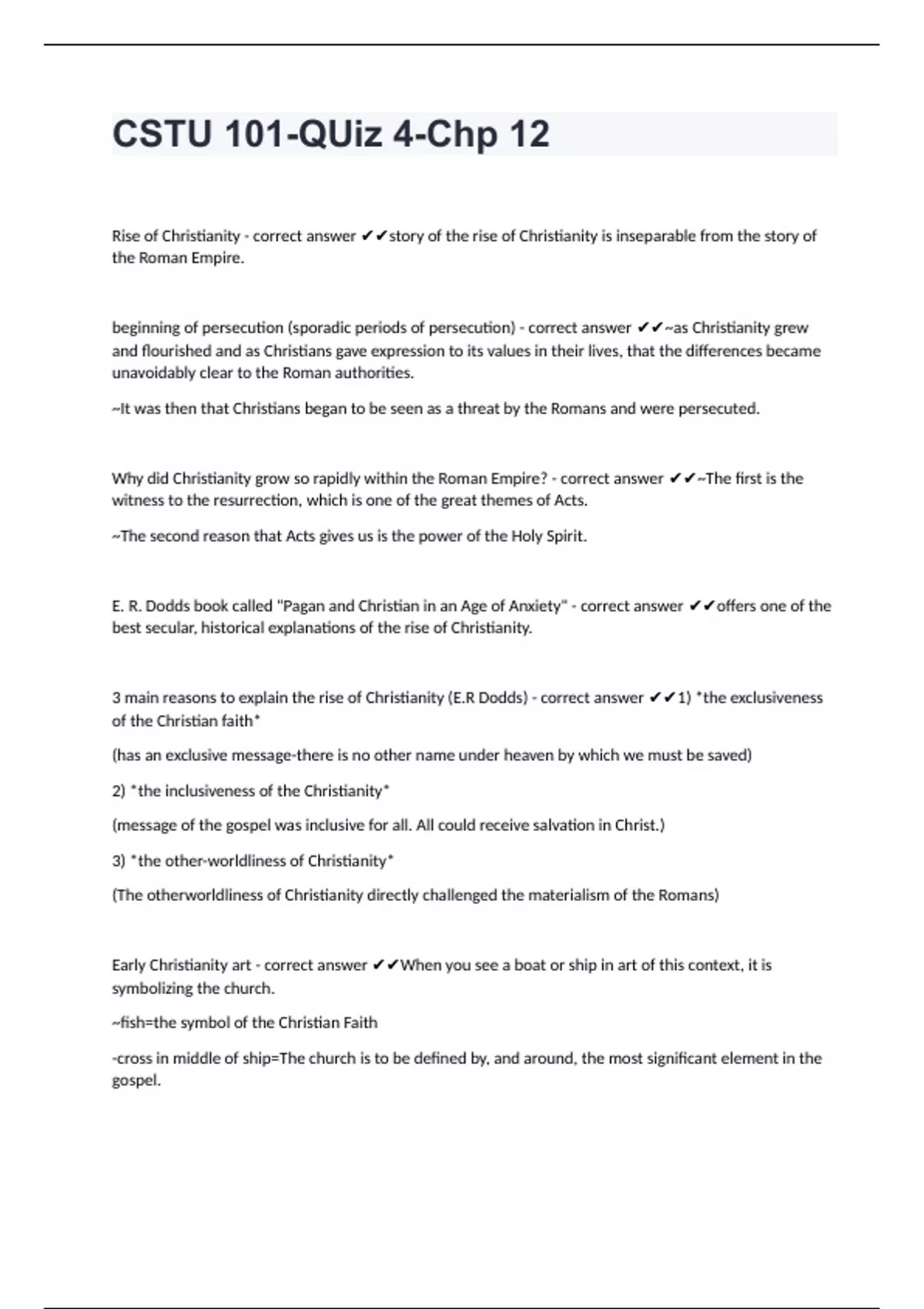 CSTU 101-QUiz 4-Chp 12Rise of Christianity - correct answer story of the rise of Christianity is inseparable from the story of the Roman Empire. beginning of persecution (sporadic periods of persecution) - correct answer ~as Christianity grew and flourished and as Christians gave expression to its values in their lives, that the differences became unavoidably clear to the Roman authorities. ~It was then that Christians began to be seen as a threat by the Romans and were persecuted. Why did Christianity grow so rapidly within the Roman Empire? - correct answer ~The first is the witness to the resurrection, which is one of the great themes of Acts. ~The second reason that Acts gives us is the power of the Holy Spirit. E. R. Dodds book called "Pagan and Christian in an Age of Anxiety" - correct answer offers one of the best secular, historical explanations of the rise of Christianity. 3 main reasons to explain the rise of Christianity (E.R Dodds) - correct answer 1) *the exclusiveness of the Christian faith* (has an exclusive message-there is no other name under heaven by which we must be saved) 2) *the inclusiveness of the Christianity* (message of the gospel was inclusive for all. All could receive salvation in Christ.) 3) *the other-worldliness of Christianity* (The otherworldliness of Christianity directly challenged the materialism of the Romans) Early Christianity art - correct answer When you see a boat or ship in art of this context, it is symbolizing the church. ~fish=the symbol of the Christian Faith -cross in middle of ship=The church is to be defined by, and around, the most significant element in the gospel.