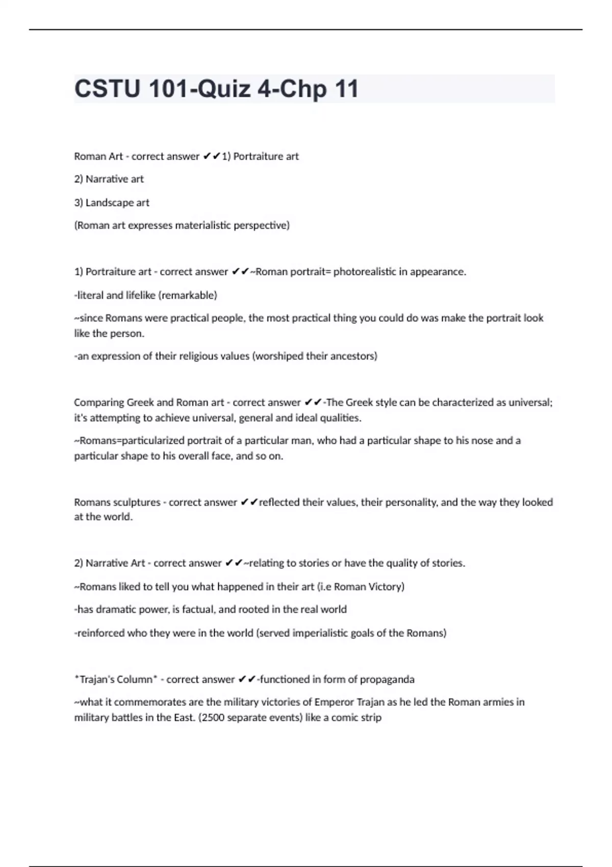 CSTU 101-Quiz 4-Chp 11Roman Art - correct answer 1) Portraiture art 2) Narrative art 3) Landscape art (Roman art expresses materialistic perspective) 1) Portraiture art - correct answer ~Roman portrait= photorealistic in appearance. -literal and lifelike (remarkable) ~since Romans were practical people, the most practical thing you could do was make the portrait look like the person. -an expression of their religious values (worshiped their ancestors) Comparing Greek and Roman art - correct answer -The Greek style can be characterized as universal; it's attempting to achieve universal, general and ideal qualities. ~Romans=particularized portrait of a particular man, who had a particular shape to his nose and a particular shape to his overall face, and so on. Romans sculptures - correct answer reflected their values, their personality, and the way they looked at the world. 2) Narrative Art - correct answer ~relating to stories or have the quality of stories. ~Romans liked to tell you what happened in their art (i.e Roman Victory) -has dramatic power, is factual, and rooted in the real world -reinforced who they were in the world (served imperialistic goals of the Romans) *Trajan's Column* - correct answer -functioned in form of propaganda ~what it commemorates are the military victories of Emperor Trajan as he led the Roman armies in military battles in the East. (2500 separate events) like a comic strip
