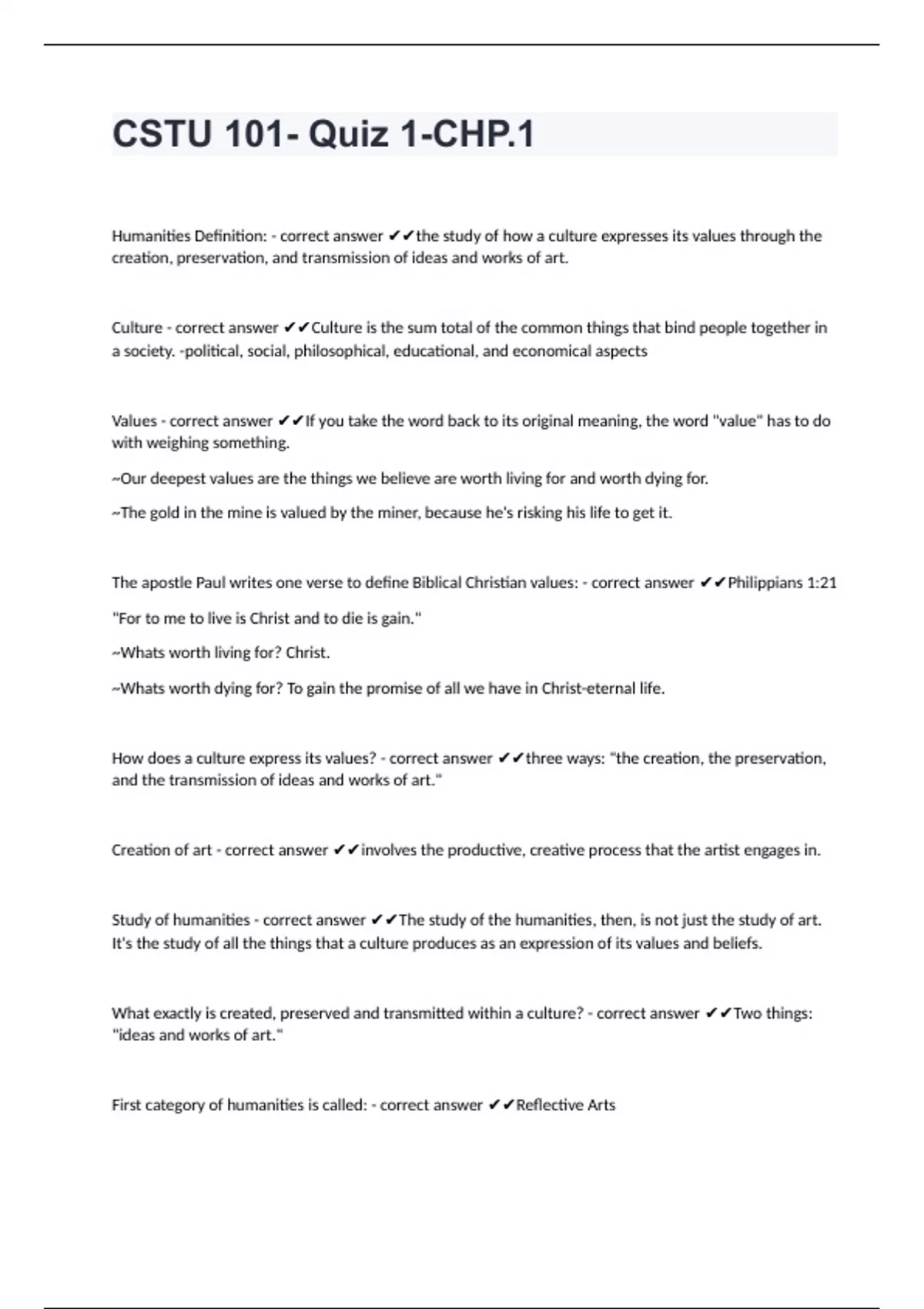 CSTU 101- Quiz 1-CHP.1Humanities Definition: - correct answer the study of how a culture expresses its values through the creation, preservation, and transmission of ideas and works of art. Culture - correct answer Culture is the sum total of the common things that bind people together in a society. -political, social, philosophical, educational, and economical aspects Values - correct answer If you take the word back to its original meaning, the word "value" has to do with weighing something. ~Our deepest values are the things we believe are worth living for and worth dying for. ~The gold in the mine is valued by the miner, because he's risking his life to get it. The apostle Paul writes one verse to define Biblical Christian values: - correct answer Philippians 1:21 "For to me to live is Christ and to die is gain." ~Whats worth living for? Christ. ~Whats worth dying for? To gain the promise of all we have in Christ-eternal life. How does a culture express its values? - correct answer three ways: "the creation, the preservation, and the transmission of ideas and works of art." Creation of art - correct answer involves the productive, creative process that the artist engages in. Study of humanities - correct answer The study of the humanities, then, is not just the study of art. It's the study of all the things that a culture produces as an expression of its values and beliefs. What exactly is created, preserved and transmitted within a culture? - correct answer Two things: "ideas and works of art."