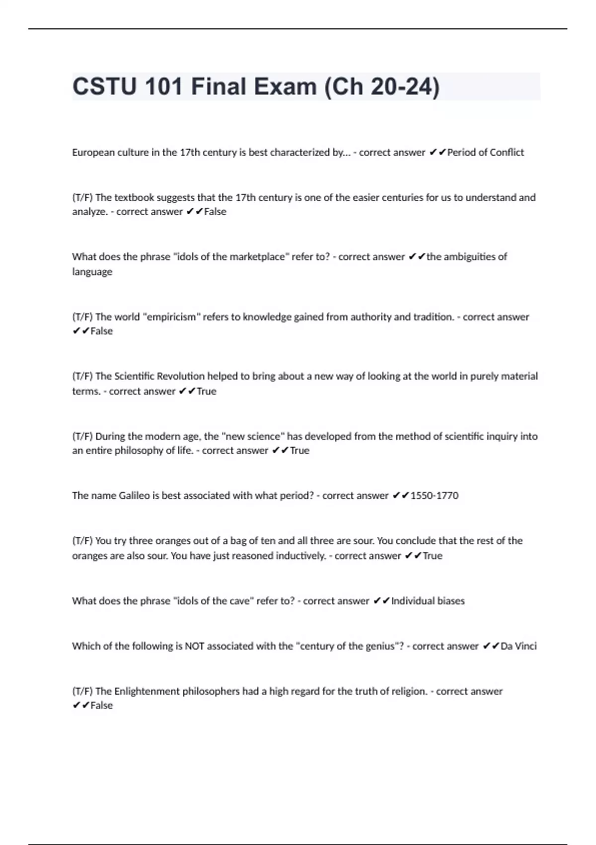 CSTU 101 Final Exam (Ch 20-24)European culture in the 17th century is best characterized by... - correct answer Period of Conflict (T/F) The textbook suggests that the 17th century is one of the easier centuries for us to understand and analyze. - correct answer False What does the phrase "idols of the marketplace" refer to? - correct answer the ambiguities of language (T/F) The world "empiricism" refers to knowledge gained from authority and tradition. - correct answer False (T/F) The Scientific Revolution helped to bring about a new way of looking at the world in purely material terms. - correct answer True (T/F) During the modern age, the "new science" has developed from the method of scientific inquiry into an entire philosophy of life. - correct answer True The name Galileo is best associated with what period? - correct answer (T/F) You try three oranges out of a bag of ten and all three are sour. You conclude that the rest of the oranges are also sour. You have just reasoned inductively. - correct answer True What does the phrase "idols of the cave" refer to? - correct answer Individual biases Which of the following is NOT associated with the "century of the genius"? - correct answer