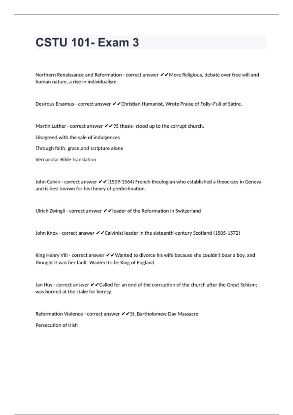CSTU 101- Exam 3Northern Renaissance and Reformation - correct answer More Religious, debate over free will and human nature, a rise in individualism. Desirous Erasmus - correct answer Christian Humanist, Wrote Praise of Folly~Full of Satire. Martin Luther - correct answer 95 thesis- stood up to the corrupt church. Disagreed with the sale of indulgences Through faith, grace,and scripture alone Vernacular Bible translation John Calvin - correct answer () French theologian who established a theocracy in Geneva and is best known for his theory of predestination. Ulrich Zwingli - correct answer leader of the Reformation in Switzerland John Knox - correct answer Calvinist leader in the sixteenth-century Scotland () King Henry VIII - correct answer Wanted to divorce his wife because she couldn't bear a boy, and thought it was her fault. Wanted to be King of England. Jan Hus - correct answer Called for an end of the corruption of the church after the Great Schism; was burned at the stake for heresy. Reformation Violence - correct answer St. Bartholomew Day Massacre Persecution of Irish