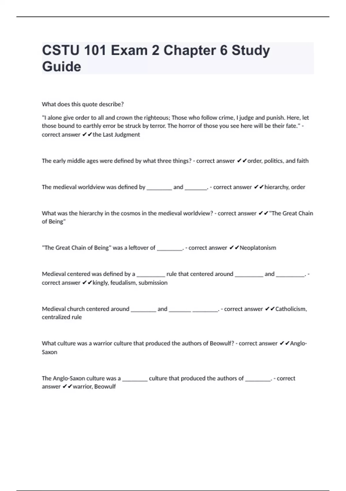 CSTU 101 Exam 2 Chapter 6 Study GuideWhat does this quote describe? "I alone give order to all and crown the righteous; Those who follow crime, I judge and punish. Here, let those bound to earthly error be struck by terror. The horror of those you see here will be their fate." - correct answer the Last Judgment The early middle ages were defined by what three things? - correct answer order, politics, and faith The medieval worldview was defined by ________ and _______. - correct answer hierarchy, order What was the hierarchy in the cosmos in the medieval worldview? - correct answer "The Great Chain of Being" "The Great Chain of Being" was a leftover of ________. - correct answer Neoplatonism Medieval centered was defined by a _________ rule that centered around _________ and _________. - correct answer kingly, feudalism, submission Medieval church centered around ________ and _______ ________. - correct answer Catholicism, centralized rule What culture was a warrior culture that produced the authors of Beowulf? - correct answer Anglo-Saxon The Anglo-Saxon culture was a ________ culture that produced the authors of ________. - correct answer warrior, Beowulf