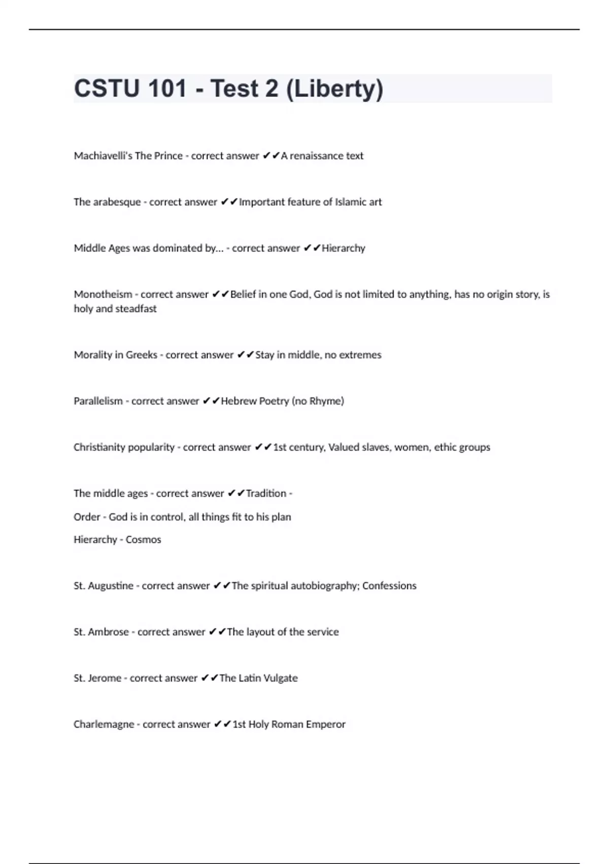 CSTU 101 - Test 2 (Liberty)Machiavelli's The Prince - correct answer A renaissance text The arabesque - correct answer Important feature of Islamic art Middle Ages was dominated by... - correct answer Hierarchy Monotheism - correct answer Belief in one God, God is not limited to anything, has no origin story, is holy and steadfast Morality in Greeks - correct answer Stay in middle, no extremes Parallelism - correct answer Hebrew Poetry (no Rhyme) Christianity popularity - correct answer 1st century, Valued slaves, women, ethic groups The middle ages - correct answer Tradition - Order - God is in control, all things fit to his plan Hierarchy - Cosmos St. Augustine - correct answer The spiritual autobiography; Confessions St. Ambrose - correct answer The layout of the service St. Jerome - correct answer The Latin Vulgate