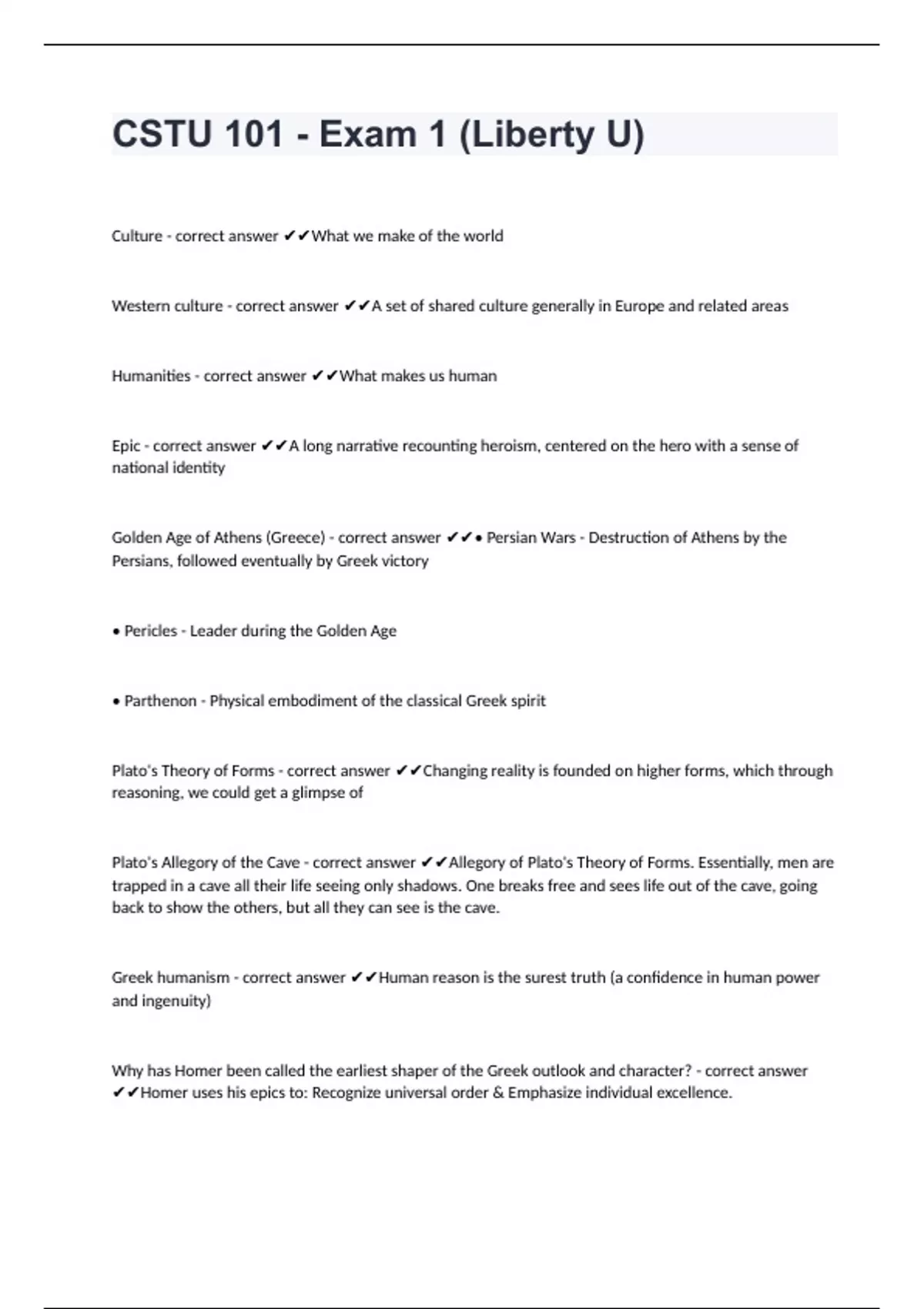CSTU 101 - Exam 1 (Liberty U)Culture - correct answer What we make of the world Western culture - correct answer A set of shared culture generally in Europe and related areas Humanities - correct answer What makes us human Epic - correct answer A long narrative recounting heroism, centered on the hero with a sense of national identity Golden Age of Athens (Greece) - correct answer • Persian Wars - Destruction of Athens by the Persians, followed eventually by Greek victory • Pericles - Leader during the Golden Age • Parthenon - Physical embodiment of the classical Greek spirit Plato's Theory of Forms - correct answer Changing reality is founded on higher forms, which through reasoning, we could get a glimpse of Plato's Allegory of the Cave - correct answer Allegory of Plato's Theory of Forms. Essentially, men are trapped in a cave all their life seeing only shadows. One breaks free and sees life out of the cave, going back to show the others, but all they can see is the cave.
