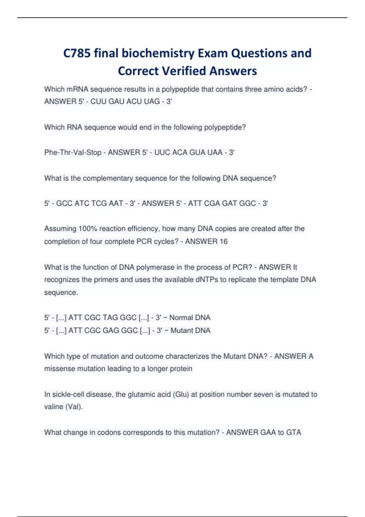 Which mRNA sequence results in a polypeptide that contains three amino acids? - ANSWER 5' - CUU GAU ACU UAG - 3' Which RNA sequence would end in the following polypeptide? Phe-Thr-Val-Stop - ANSWER 5' - UUC ACA GUA UAA - 3' What is the complementary sequence for the following DNA sequence? 5' - GCC ATC TCG AAT - 3' - ANSWER 5' - ATT CGA GAT GGC - 3' Assuming 100% reaction efficiency, how many DNA copies are created after the completion of four complete PCR cycles? - ANSWER 16 What is the function of DNA polymerase in the process of PCR? - ANSWER It recognizes the primers and uses the available dNTPs to replicate the template DNA sequence.