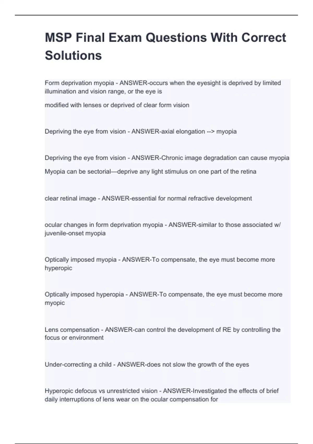 Form deprivation myopia - ANSWER-occurs when the eyesight is deprived by limited illumination and vision range, or the eye is modified with lenses or deprived of clear form vision Depriving the eye from vision - ANSWER-axial elongation --> myopia Depriving the eye from vision - ANSWER-Chronic image degradation can cause myopia Myopia can be sectorial—deprive any light stimulus on one part of the retina clear retinal image - ANSWER-essential for normal refractive development ocular changes in form deprivation myopia - ANSWER-similar to those associated w/ juvenile-onset myopia Optically imposed myopia - ANSWER-To compensate, the eye must become more hyperopic Optically imposed hyperopia - ANSWER-To compensate, the eye must become more myopic Lens compensation - ANSWER-can control the development of RE by controlling the focus or environment Under-correcting a child - ANSWER-does not slow the growth of the eyes Hyperopic defocus vs unrestricted vision - ANSWER-Investigated the effects of brief daily interruptions of lens wear on the ocular compensation for negative lenses in infant monkeys