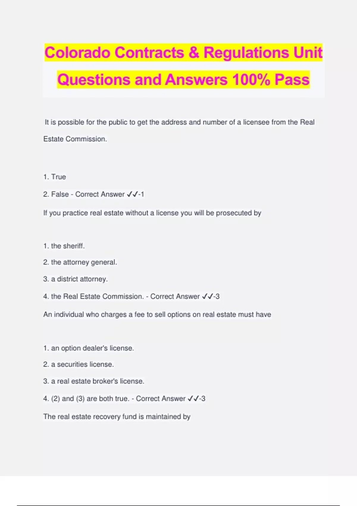 Colorado Contracts & Regulations Unit Questions and Answers 100% Pass It is possible for the public to get the address and number of a licensee from the Real Estate Commission. 1. True 2. False - Correct Answer ️️ -1 If you practice real estate without a license you will be prosecuted by 1. the sheriff. 2. the attorney general. 3. a district attorney. 4. the Real Estate Commission. - Correct Answer ️️ -3 An individual who charges a fee to sell options on real estate must have 1. an option dealer's license. 2. a securities license. 3. a real estate broker's license. 4. (2) and (3) are both true. - Correct Answer ️️ -3 The real estate recovery fund is maintained by 1. the State Treasurer. 2. the Real Estate Commission. 3. the State Judiciary. 4. the State Legislature. - Correct Answer ️️ -1 The recovery fund could be used for 1. payment of out-of-pocket losses and reasonable attorney fees to the public in civil suits against licensees. 2. payment of out-of-pocket losses and reasonable attorney fees to the public in criminal suits against licensees. 3. negligence even if the licensee has errors and omissions insurance coverage. 4. all of the above. - Correct Answer ️️ -1 The number of hours of continuing education you must complete to renew your license every three years is 1. 24 2. 16 3. 8 4. 36 - Correct Answer ️️ -1 An initial license issued to a broker will be 1. for the remainder of the current year, expiring on December 31st 2. for a 3-year period commencing on the issuance date 3. for a 1-year period commencing on the issuance date 4. for 3 years expiring on December 31st - Correct Answer ️️ -2 The Real Estate Commission requires an office policy manual to cover all the following except 1. handling back-up contracts. 2. brokerage relationships. 3. commission splits. 4. fair housing/affirmative action marketing. - Correct Answer ️️ -3 You must renew your license every 1. year. 2. every 2 years. 3. every 3 years. 4. every 6 years. - Correct Answer ️️ -3 Brokers are allowed to charge the buyers and/or sellers for closing costs that do not include "document preparation". 1. Always. 2. only if the sellers and buyers agree, either orally or in writing, to be charged. 3. only if the sellers and buyers agree, in writing, to be charged. 4. Never - Correct Answer ️️ -3 The reasoning behind the creation of the "single licensing law" was 1. to bring the law in line with actual practice. 2. to stop the practice of a new real estate broker working independently, as their own company. 3. to stop the practice of real estate brokers overseeing newly licensees. 4. (1) & (2) are both true. - Correct Answer ️️ -4 Does Colorado law dictate the ethical standards for the real est