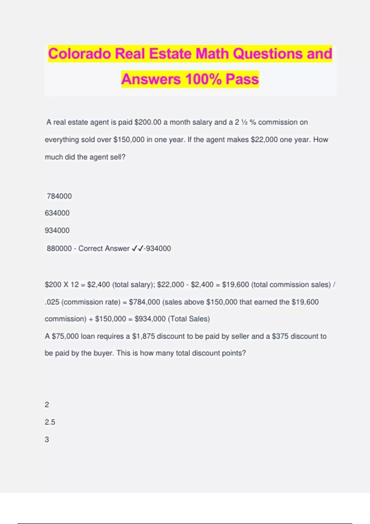 Colorado Real Estate Math Questions and Answers 100% Pass A real estate agent is paid $200.00 a month salary and a 2 ½ % commission on everything sold over $150,000 in one year. If the agent makes $22,000 one year. How much did the agent sell? 784000 634000 934000 880000 - Correct Answer ️️ -934000 $200 X 12 = $2,400 (total salary); $22,000 - $2,400 = $19,600 (total commission sales) / .025 (commission rate) = $784,000 (sales above $150,000 that earned the $19,600 commission) + $150,000 = $934,000 (Total Sales) A $75,000 loan requires a $1,875 discount to be paid by seller and a $375 discount to be paid by the buyer. This is how many total discount points? 2 2.5 3 3.5 - Correct Answer ️️ -3 $1875 + $375 = $2,250. I / V = R. $2,250 / $75,000 = .03 An investor earned $27,500 on a $375,000 investment. What is the rate of return? 0.115 0.073 0.136 0.094 - Correct Answer ️️ -0.073 $27,500 / $375,000 = 7.3% If the scale drawing for a lot is 3 inches by 4 inches and the actual lot is 90 feet x 120 feet, how many feet would be represented by 5 1/4 inches? 210.00 feet 157.50 feet 127.50 feet 180.00 feet - Correct Answer ️️ -157.50 feet 90' / 3" or 120' / 4" = 30 ' per inch; 30' per inch X 5.25" = 157.5' As a property manager, you have an agreement that your fee will be 8% on the first $150,000 gross rent, 5% on the next $100,000, and 2.5% on everything over the $250,000. If last year's gross rent was $417,500 what was the management fee? 4187.5 9187.5 21187.5 16187.5 - Correct Answer ️️ -21187.5 First calculate the commission earned on the first tier - ($150,000 X .08 = $12,000 commission) then calculate the commission on the second tier - ($100,000 X .05 = $5,000) then calculate the amount of the remaining gross rent over $250,000 - ($417,500 - ($150,000 + $100,000) = $167,500) then calculate the commission on the remaining amount ($167,500 X .025 = $4,187.50). Add the commissions together $12,000 + $5,000 + $4,187.50 = $21,187.50 total management fee A loan company will provide a loan to Bill and Hillary for 75% of the appraised value of their home. The interest rate is 10.5%. The first monthly interest payment is $820. The bank requires 4 discount points (hint: a discount point is 1% of the loan amount) to obtain this interest rate. How much will the discount points cost? 2840 3749 5575 9714 - Correct Answer ️️ -3749 $820 x 12 = $9,840 annual interest paid. $9,840 / .105 (annual interest converted to a decimal) = $93,714.28 Total Loan Amount. $93,714 x .04 (A discount point is 1% of the loan amount - you have 4 of them) = $3.749.57 in Discount Points Mr. Baker sold his house for $27,000, which is a 10% loss over what he originally paid for it. What did he pay for the house originally? 28000 30000 33000 35000 - Correct Answer ️️ -30000 How many 50-foot by 110-foot lots could be obtained from an acre of l