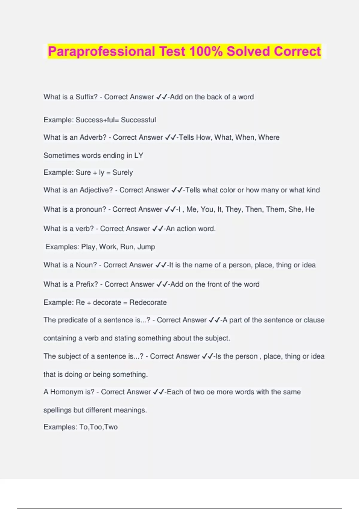 Paraprofessional Test 100% Solved Correct What is a Suffix? - Correct Answer ️️ -Add on the back of a word Example: Success+ful= Successful What is an Adverb? - Correct Answer ️️ -Tells How, What, When, Where Sometimes words ending in LY Example: Sure + ly = Surely What is an Adjective? - Correct Answer ️️ -Tells what color or how many or what kind What is a pronoun? - Correct Answer ️️ -I , Me, You, It, They, Then, Them, She, He What is a verb? - Correct Answer ️️ -An action word. Examples: Play, Work, Run, Jump What is a Noun? - Correct Answer ️️ -It is the name of a p