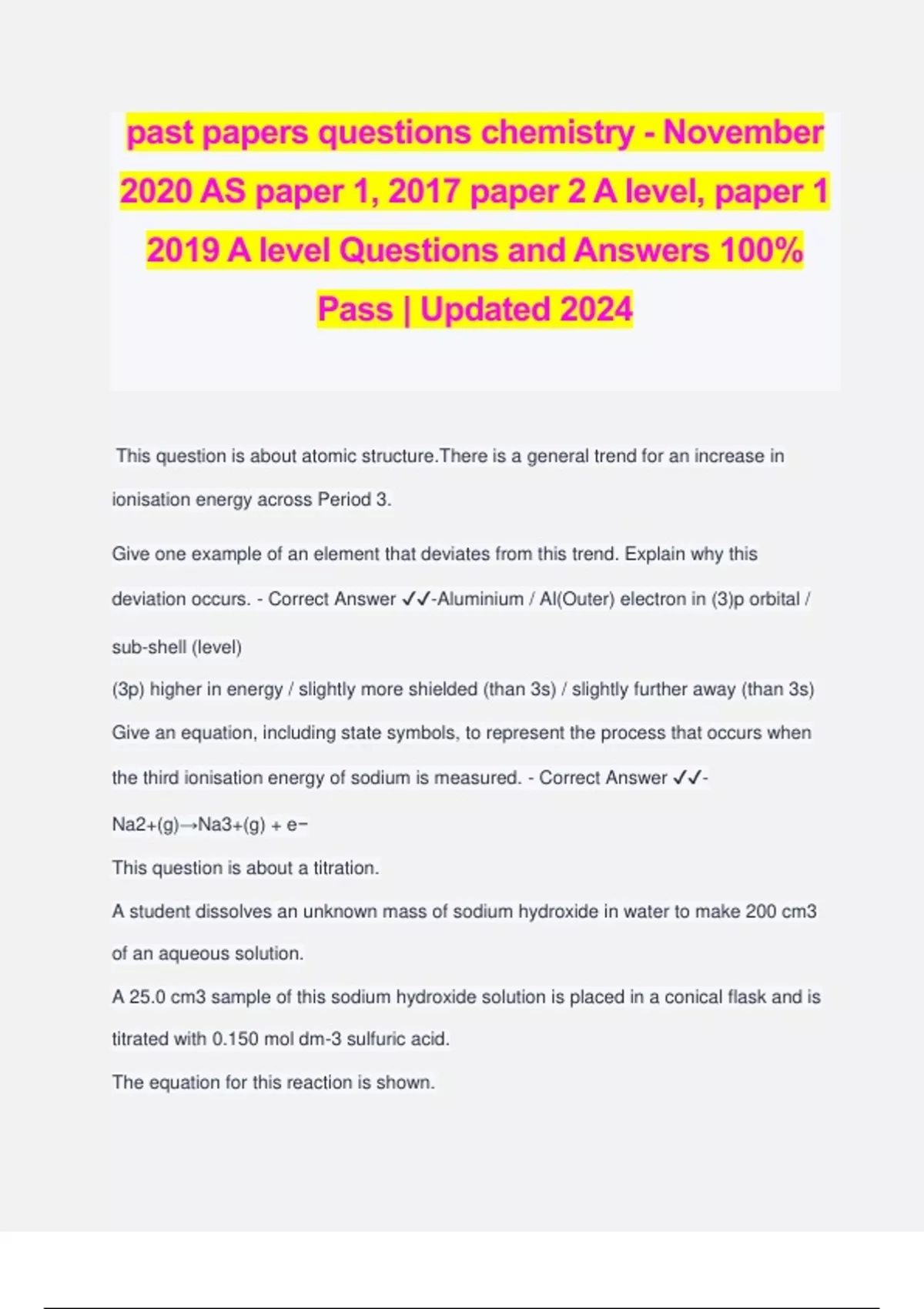 past papers questions chemistry - November 2020 AS paper 1, 2017 paper 2 A level, paper 1 2019 A level Questions and Answers 100% Pass | Updated 2024 This question is about atomic structure.There is a general trend for an increase in ionisation energy across Period 3. Give one example of an element that deviates from this trend. Explain why this deviation occurs. - Correct Answer ️️ -Aluminium / Al(Outer) electron in (3)p orbital / sub-shell (level) (3p) higher in energy / slightly more shielded (than 3s) / slightly further away (than 3s) Give an equation, including state symbols, to represent the process that occurs when the third ionisation energy of sodium is measured. - Correct Answer ️️ - Na2+(g)→Na3+(g) + e− This question is about a titration. A student dissolves an unknown mass of sodium hydroxide in water to make 200 cm3 of an aqueous solution. A 25.0 cm3 sample of this sodium hydroxide solution is placed in a conical flask and is titrated with 0.150 mol dm-3 sulfuric acid. The equation for this reaction is shown. 2NaOH(aq) + H2SO4(aq) → Na2SO4(aq) + 2H2O(l) Table 1 shows the results of the titrations. (check paper for table - November 2020 as paper 1) Calculate the mass of sodium hydroxide used to make the original solution. - Correct Answer ️️ -Volume of H2SO4= (19.60 + 19.55) / 2 = (19.575 cm3 / 19.58 cm3) moles of H2SO4 = concentration x volume = 0.150 x (19.575 / 1000) (= 2.936 x 10-3 mol) Moles of NaOH in 25 cm3 = 2.936 x 10-3 x 2 = 5.87 x 10^-3mol moles of NaOH in original 200cm3 = 5.87 x 10^-3 x 8 = (= 0.04698 mol) Mass of NaOH = Mr x moles = 40.0 x 0.04698 = 1.88 g (1.9 g) The student uses a funnel to fill the burette with sulfuric acid before starting the titration. After filling, the student forgets to remove the funnel from the top of the burette. Suggest why this might affect the titre volume recorded. - Correct Answer ️️ - Additional drops of solution could have entered the burette from the funnel, (making the value on the burette lower). State one advantage of using a conical flask rather than a beaker for the titration. - Correct Answer ️️ -Less chance of splashing/losing any solution using a conical flask (when swirling) In a TOF mass spectrometer, ions are accelerated to the same kinetic energy (KE). The kinetic energy of an ion is given by the equation KE = 12 mv2 Where:KE = kinetic energy / J m = mass / kgv = speed / ms-1 In a TOF mass spectrometer, each 84Kr+ ion is accelerated to a kinetic energy of 4.83 × 10−16 J and the time of flight is 1.72 × 10−5 s Calculate the length, in metres, of the TOF flight tube. The Avogadro constant, L = 6.022 × 1023 mol−1 - Correct Answer ️️ -m = (84/1000)/6.022 x 10^23 = 1.395 x 10^- 25kg v^2 = 2ke/m =2x(4.83×10−16)/(1.395x10-25) v = √() = 83214.97 d =v x t= 83214.97 x 1.72 × 10−5 = 1.43 (m) A student determines the enthalpy change for the reaction between