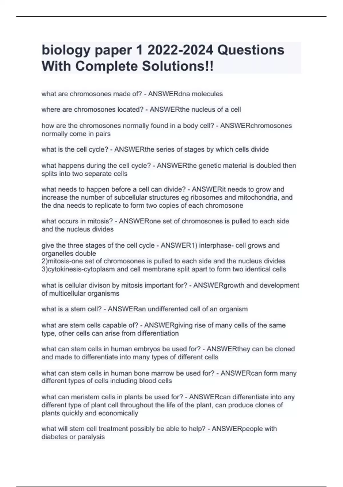 what are chromosones made of? - ANSWERdna molecules where are chromosones located? - ANSWERthe nucleus of a cell how are the chromosones normally found in a body cell? - ANSWERchromosones normally come in pairs what is the cell cycle? - ANSWERthe series of stages by which cells divide what happens during the cell cycle? - ANSWERthe genetic material is doubled then splits into two separate cells what needs to happen before a cell can divide? - ANSWERit needs to grow and increase the number of subcellular structures eg ribosomes and mitochondria, and the dna needs to replicate to form two copies of each chromosone what occurs in mitosis? - ANSWERone set of chromosones is pulled to each side and the nucleus divides give the three stages of the cell cycle - ANSWER1) interphase- cell grows and organelles double 2)mitosis-one set of chromosones is pulled to each side and the nucleus divides 3)cytokinesis-cytoplasm and cell membrane split apart to form two identical cells what is cellular divison by mitosis important for? - ANSWERgrowth and development of multicellular organisms what is a stem cell? - ANSWERan undifferented cell of an organism what are stem cells capable of? - ANSWERgiving rise of many cells of the same type, other cells can arise from differentiation what can stem cells in human embryos be used for? - ANSWERthey can be cloned and made to differentiate into many types of different cells what can stem cells in human bone marrow be used for? - ANSWERcan form many different types of cells including blood cells what can meristem cells in plants be used for? - ANSWERcan differentiate into any different type of plant cell throughout the life of the plant, can produce clones of plants quickly and economically what will stem cell treatment possibly be able to help? - ANSWERpeople with diabetes or paralysis what occurs in therapeutic cloning? - ANSWERan embryo is produced with the same genes as the patient why is therapeutic cloning carried out? - ANSWERstem cells from the embryo are not rejected by the persons body, so they may be used for medical treatment what potential risks do the use of stem cells have? - ANSWERtransfer of viral infections