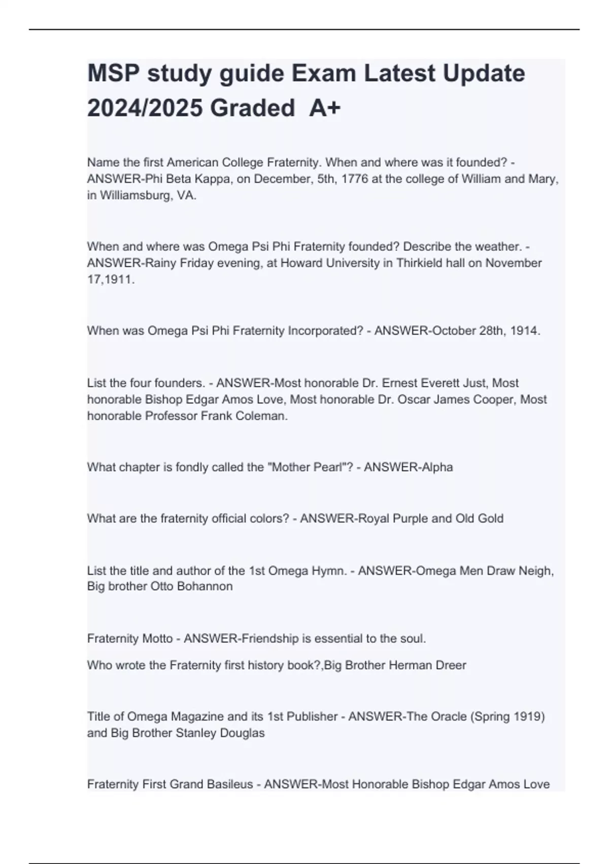 Name the first American College Fraternity. When and where was it founded? - ANSWER-Phi Beta Kappa, on December, 5th, 1776 at the college of William and Mary, in Williamsburg, VA. When and where was Omega Psi Phi Fraternity founded? Describe the weather. - ANSWER-Rainy Friday evening, at Howard University in Thirkield hall on November 17,1911. When was Omega Psi Phi Fraternity Incorporated? - ANSWER-October 28th, 1914. List the four founders. - ANSWER-Most honorable Dr. Ernest Everett Just, Most honorable Bishop Edgar Amos Love, Most honorable Dr. Oscar James Cooper, Most honorable Professor Frank Coleman. What chapter is fondly called the "Mother Pearl"? - ANSWER-Alpha What are the fraternity official colors? - ANSWER-Royal Purple and Old Gold List the title and author of the 1st Omega Hymn. - ANSWER-Omega Men Draw Neigh, Big brother Otto Bohannon Fraternity Motto - ANSWER-Friendship is essential to the soul. Who wrote the Fraternity first history book?,Big Brother Herman Dreer Title of Omega Magazine and its 1st Publisher - ANSWER-The Oracle (Spring 1919) and Big Brother Stanley Douglas Fraternity First Grand Basileus - ANSWER-Most Honorable Bishop Edgar Amos Love