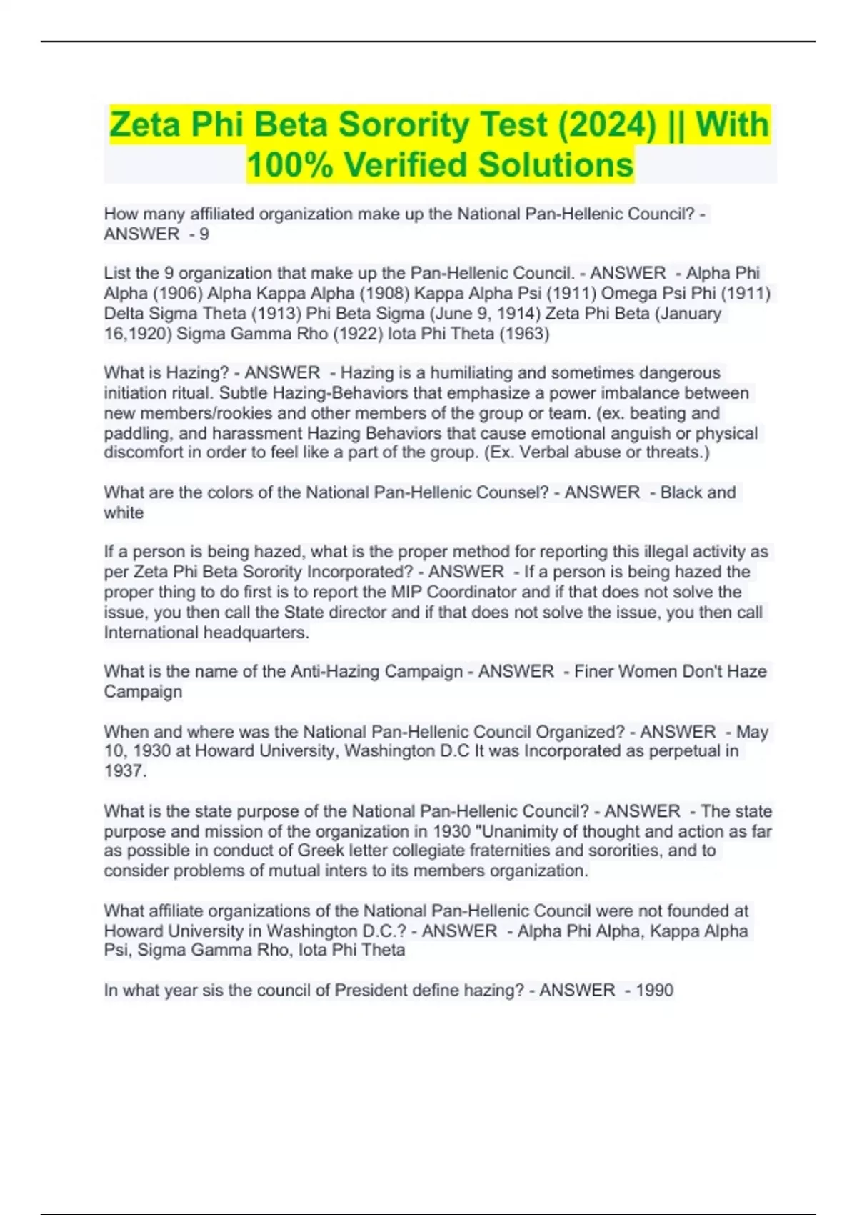 Zeta Phi Beta Sorority Test (2024) || With 100% Verified Solutions Zeta Phi Beta Sorority Test (2024) || With 100% Verified Solutions How many affiliated organization make up the National Pan-Hellenic Council? - ANSWER - 9 List the 9 organization that make up the Pan-Hellenic Council. - ANSWER - Alpha Phi Alpha (1906) Alpha Kappa Alpha (1908) Kappa Alpha Psi (1911) Omega Psi Phi (1911) Delta Sigma Theta (1913) Phi Beta Sigma (June 9, 1914) Zeta Phi Beta (January 16,1920) Sigma Gamma Rho (1922) Iota Phi Theta (1963) What is Hazing? - ANSWER - Hazing is a humiliating and sometimes dangerous initiation ritual. Subtle Hazing-Behaviors that emphasize a power imbalance between new members/rookies and other members of the group or team. (ex. beating and paddling, and harassment Hazing Behaviors that cause emotional anguish or physical discomfort in order to feel like a part of the group. (Ex. Verbal abuse or threats.) What are the colors of the National Pan-Hellenic Counsel? - ANSWER - Black and white If a person is being hazed, what is the proper method for reporting this illegal activity as per Zeta Phi Beta Sorority Incorporated? - ANSWER - If a person is being hazed the proper thing to do first is to report the MIP Coordinator and if that does not solve the issue, you then call the State director and if that does not solve the issue, you then call International headquarters. What is the name of the Anti-Hazing Campaign - ANSWER - Finer Women Don't Haze Campaign When and where was the National Pan-Hellenic Council Organized? - ANSWER - May 10, 1930 at Howard University, Washington D.C It was Incorporated as perpetual in 1937. What is the state purpose of the National Pan-Hellenic Council? - ANSWER - The state purpose and mission of the organization in 1930 "Unanimity of thought and action as far as possible in conduct of Greek letter collegiate fraternities and sororities, and to consider problems of mutual inters to its members organization. What affiliate organizations of the National Pan-Hellenic Council were not founded at Howard University in Washington D.C.? - ANSWER - Alpha Phi Alpha, Kappa Alpha Psi, Sigma Gamma Rho, Iota Phi Theta In what year sis the council of President define hazing? - ANSWER - 1990 When and where was Zeta Phi Beta Sorority Incorporated founded? - ANSWER - January 16, 1920 at Howard University in Washington D.C. Five Founders