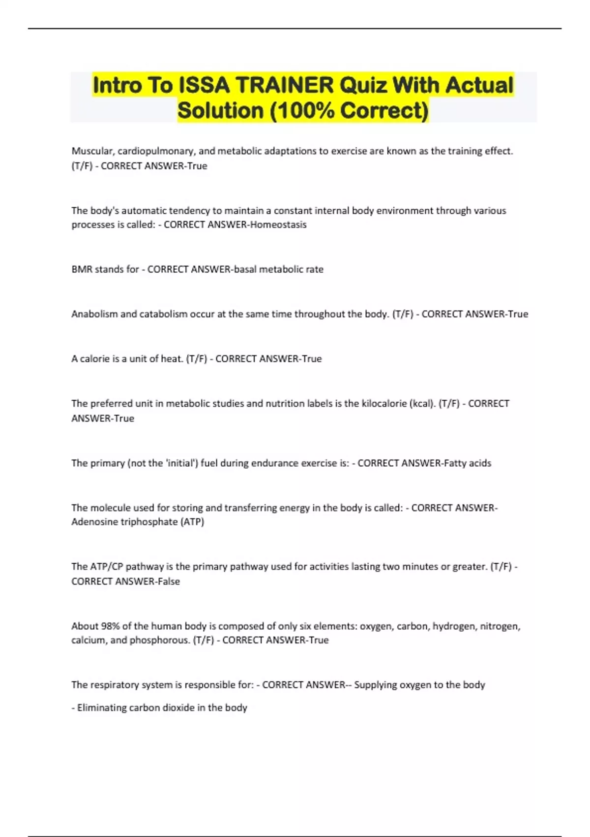 Intro To ISSA TRAINER Quiz With Actual Solution (100% Correct) Muscular, cardiopulmonary, and metabolic adaptations to exercise are known as the training effect. (T/F) - CORRECT ANSWER-True The body's automatic tendency to maintain a constant internal body environment through various processes is called: - CORRECT ANSWER-Homeostasis BMR stands for - CORRECT ANSWER-basal metabolic rate Anabolism and catabolism occur at the same time throughout the body. (T/F) - CORRECT ANSWER-True A calorie is a unit of heat. (T/F) - CORRECT ANSWER-True