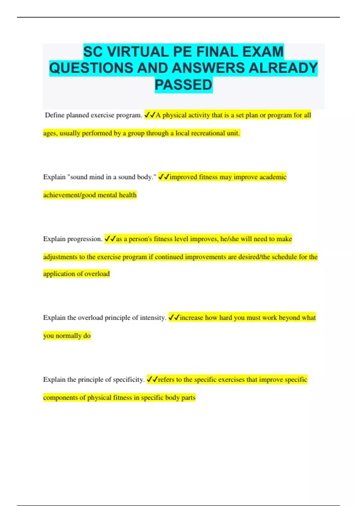 SC VIRTUAL PE FINAL EXAM QUESTIONS AND ANSWERS ALREADY PASSED Define planned exercise program. A physical activity that is a set plan or program for all ages, usually performed by a group through a local recreational unit. Explain "sound mind in a sound body." improved fitness may improve academic achievement/good mental health Explain progression. as a person's fitness level improves, he/she will need to make adjustments to the exercise program if continued improvements are desired/the schedule for the application of overload Explain the overload principle of intensity. increase how hard you must work beyond what you normally do Explain the principle of specificity. refers to the specific exercises that improve specific components of physical fitness in specific body parts Frequency refers to? how often you exercise a week How do they apply to improving your physical fitness? they help you develop safe and effective ways to improve your physical fitness How does participating in sports activities benefit the highly skilled? The poorly skilled? the highly skilled are able to sustain fitness. the poorly skilled are not benefited. How is muscular fitness a benefit of exercise? most teenagers want a strong, healthy body/it improves your body image How often a person exercises is called? frequency List some self-directed physical activities. walking/jogging, biking, swimming What affects your energy levels? lifestyle choices What are a series of exercises interspersed with rest periods? interval training What are good strategies for setting goals? include
