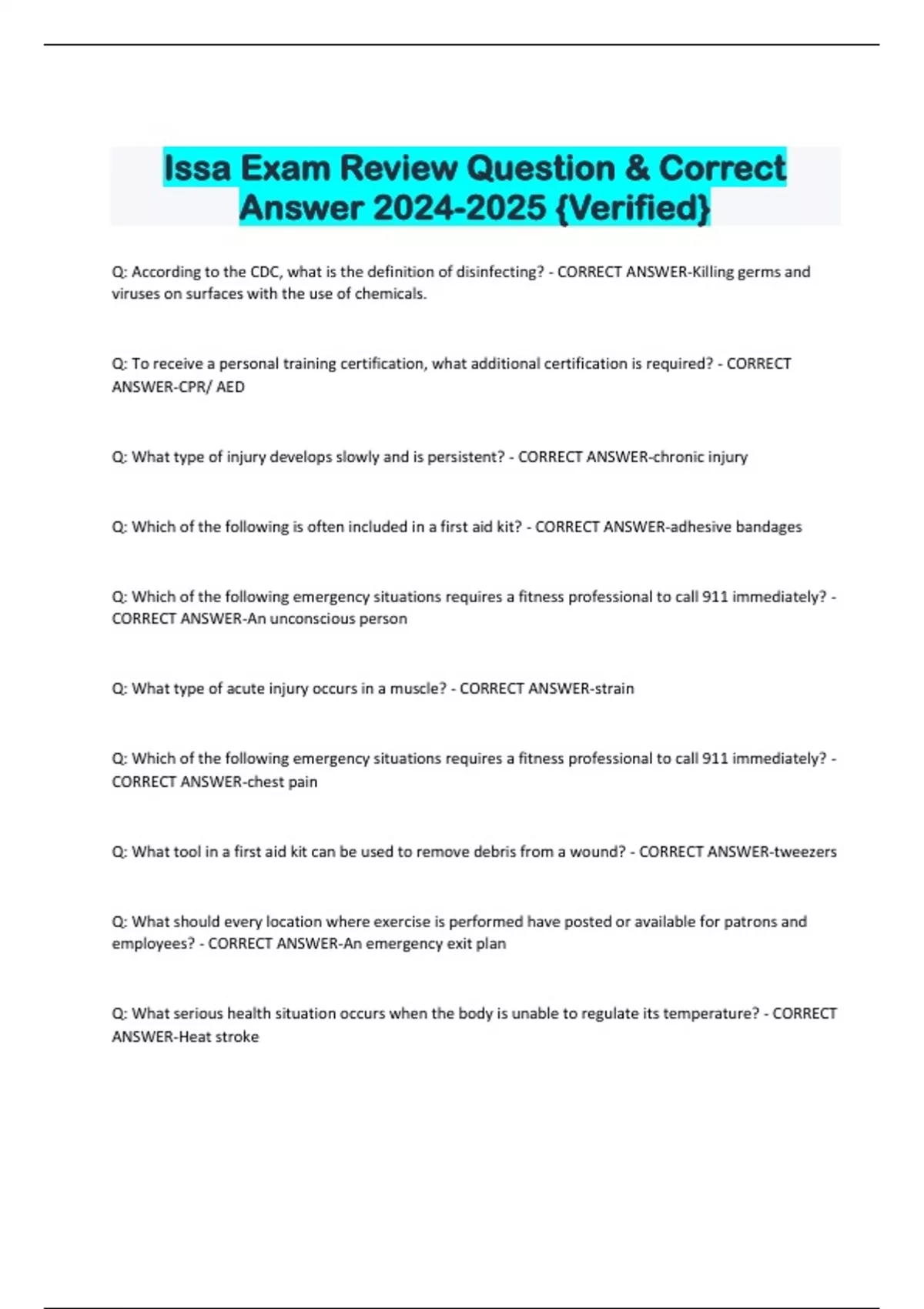 Issa Exam Review Question & Correct Answer {Verified} Q: According to the CDC, what is the definition of disinfecting? - CORRECT ANSWER-Killing germs and viruses on surfaces with the use of chemicals. Q: To receive a personal training certification, what additional certification is required? - CORRECT ANSWER-CPR/ AED Q: What type of injury develops slowly and is persistent? - CORRECT ANSWER-chronic injury Q: Which of the following is often included in a first aid kit? - CORRECT ANSWER-adhesive bandages Q: Which of the following emergency situations requires a fitness professional to call 911 immediately? - CORRECT ANSWER-An unconscious person