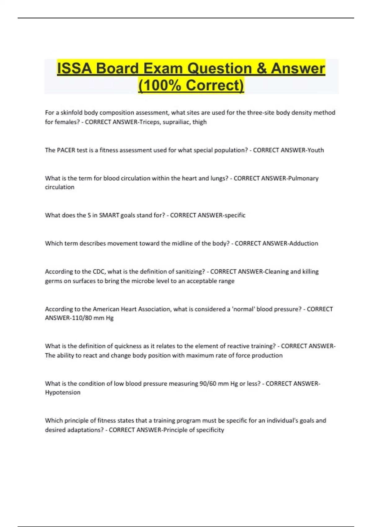 ISSA Board Exam Question & Answer (100% Correct) For a skinfold body composition assessment, what sites are used for the three-site body density method for females? - CORRECT ANSWER-Triceps, suprailiac, thigh The PACER test is a fitness assessment used for what special population? - CORRECT ANSWER-Youth What is the term for blood circulation within the heart and lungs? - CORRECT ANSWER-Pulmonary circulation What does the S in SMART goals stand for? - CORRECT ANSWER-specifi