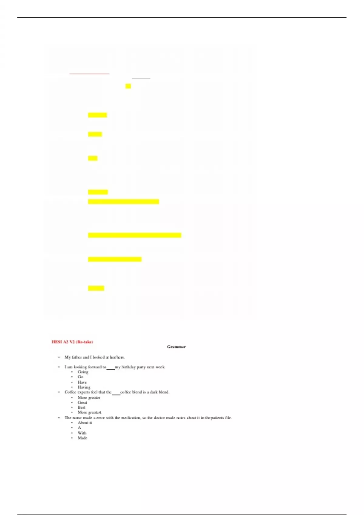 HESI A2 V2 (Re-take) Grammar • My father and I looked at her/hers. • I am looking forward to my birthday party next week. • Going • Go • Have • Having • Coffee experts feel that the coffee blend is a dark blend. • More greater • Great • Best • More greatest • The nurse made a error with the medication, so the doctor made notes about it in thepatients file. • About it • A • With • Made • Finishing isn’t as important as answering correctly. • Quick • As quick • So quickist • Quickly • Which sentence is grammatically correct? • A lot of people enjoy baseball movies. • The patient said he took alot of pills yesterday. • Alotts of time drivers go too fast. • Which sentence is grammatically incorrect? • Everyone enjoys ripping the wrapping paper off their holiday gifts. • The racer ran swiftly down the track. • The red fox jumped quickly over the sleeping dog. • She lit scented candles so the air will smell sweetly. • Which sentence is grammatically correct? • It is important to too spell correctly. • I have two go to the gym. • We have too kinds of desserts. • It is too heavy for me to lift. • Which word is not used correctly in the sentence? They’re going to the mall to pick up there uniforms for their coach. • Their • Going • They’re • There • After throwing their sleeping bags into the backseat of their car, they more than 400miles to reach their destination. • Driving • Having driven • Drove • Had drove • Place the four words in alphabetical order. • Assemble, assembled, assembling, assembly • Assembly, assemble, assembled, assembling • Assemble, assembly, assembling, assembled • Assemble, assembly, assembled, assembling • The shopper was angry when he realized he it cheaper at the other store. • Get • Could have got • Could have gotten • Might have get • Which sentence is not grammatically correct? • Because he did not examine the patient, the healthcare provider prescribed herwith the wrong medication. • The nurse decided to bathe the client, than trim his nails. • The dietician, through negligence, made a mistake with the diet plan. • Since the child was feeling ill, the nurse sent him home. • What is a salutation in this address? • 1600 Pennsylvania Ave. • 20003 (Area code) • Ryan • Mr. • I the package on the table. • Layed • Drop • Laid • Lay • Which sentence uses fast as an adverb? • The cars on the overpass moved fast. • The clock on the wall is 10 minutes fast. • The batter could not hit the fast pitch • The fast cars drove over the bridge • Most children must learn for the importance of good manners. • Themself • Theirself • Theirselves • Themselves • Be careful not to the bottle while you carry it to the table. • Brak • Break • Brick