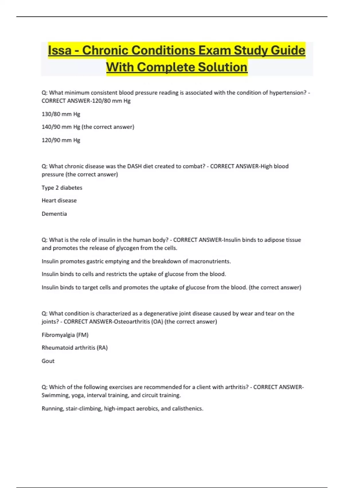 Issa - Chronic Conditions Exam Study Guide With Complete Solution Q: What minimum consistent blood pressure reading is associated with the condition of hypertension? - CORRECT ANSWER-120/80 mm Hg 130/80 mm Hg 140/90 mm Hg (the correct answer) 120/90 mm Hg Q: What chronic disease was the DASH diet created to combat? - CORRECT ANSWER-High blood pressure (the correct answer) Type 2 diabetes Heart disease Dementia