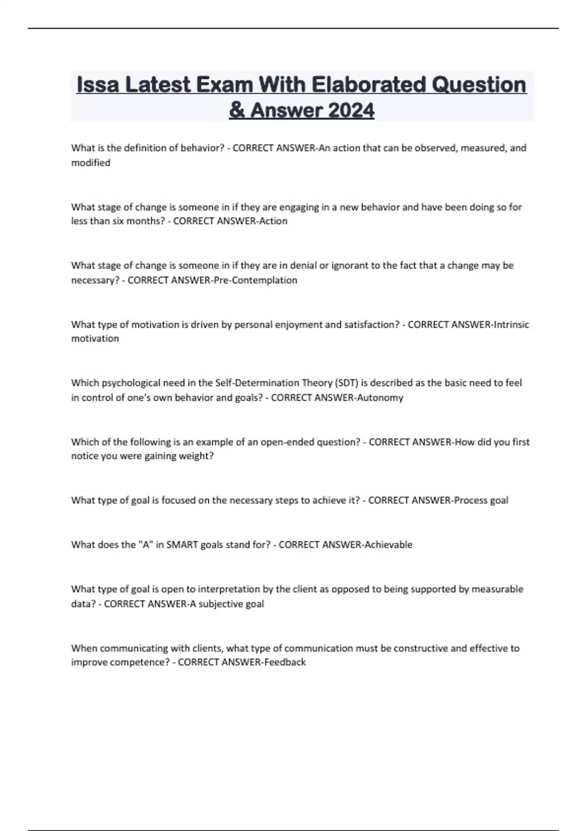 Issa Latest Exam With Elaborated Question & Answer 2024 What is the definition of behavior? - CORRECT ANSWER-An action that can be observed, measured, and modified What stage of change is someone in if they are engaging in a new behavior and have been doing so for less than six months? - CORRECT ANSWER-Action What stage of change is someone in if they are in denial or ignorant to the fact that a change may be necessary? - CORRECT ANSWER-Pre-Contemplation What type of motivation is driven by personal enjoyment and satisfaction? - CORRECT ANSWER-Intrinsic motivation