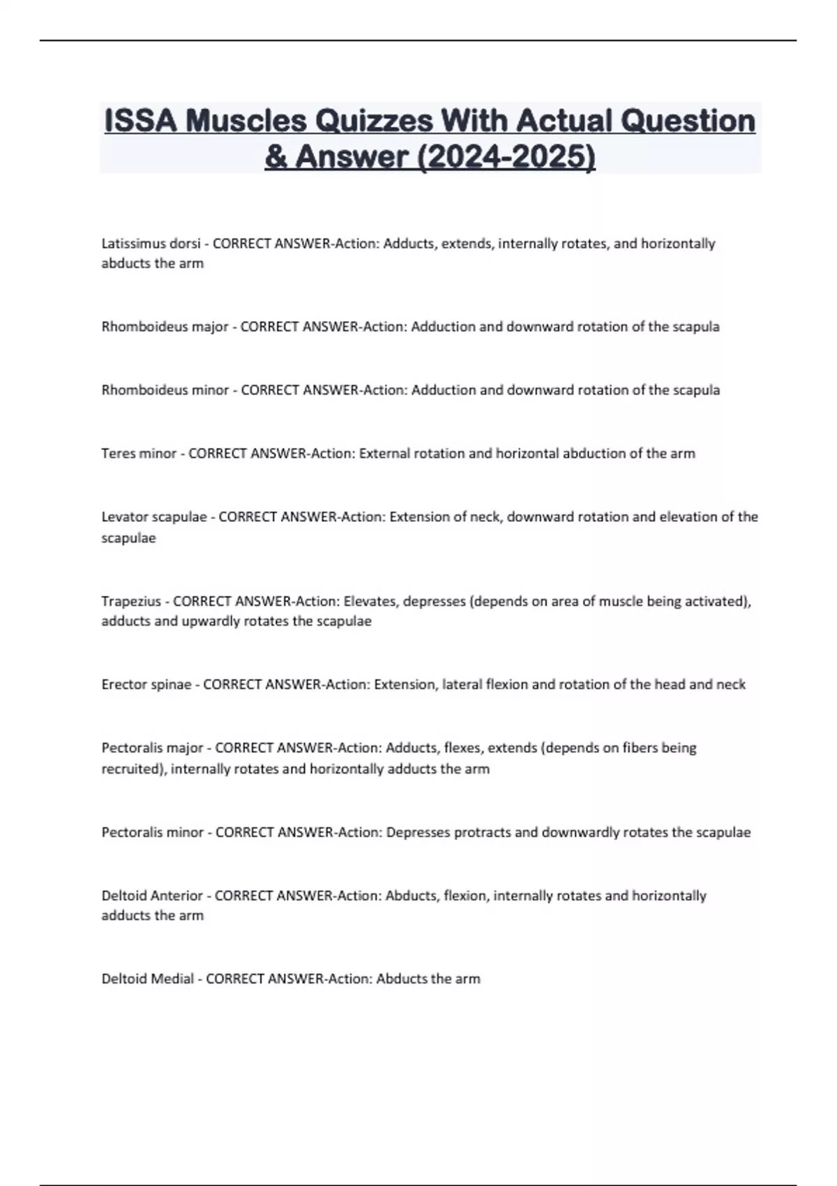 ISSA Muscles Quizzes With Actual Question & Answer () Latissimus dorsi - CORRECT ANSWER-Action: Adducts, extends, internally rotates, and horizontally abducts the arm Rhomboideus major - CORRECT ANSWER-Action: Adduction and downward rotation of the scapula Rhomboideus minor - CORRECT ANSWER-Action: Adduction and downward rotation of the scapula Teres minor - CORRECT ANSWER-Action: External rotation and horizontal abduction of the arm