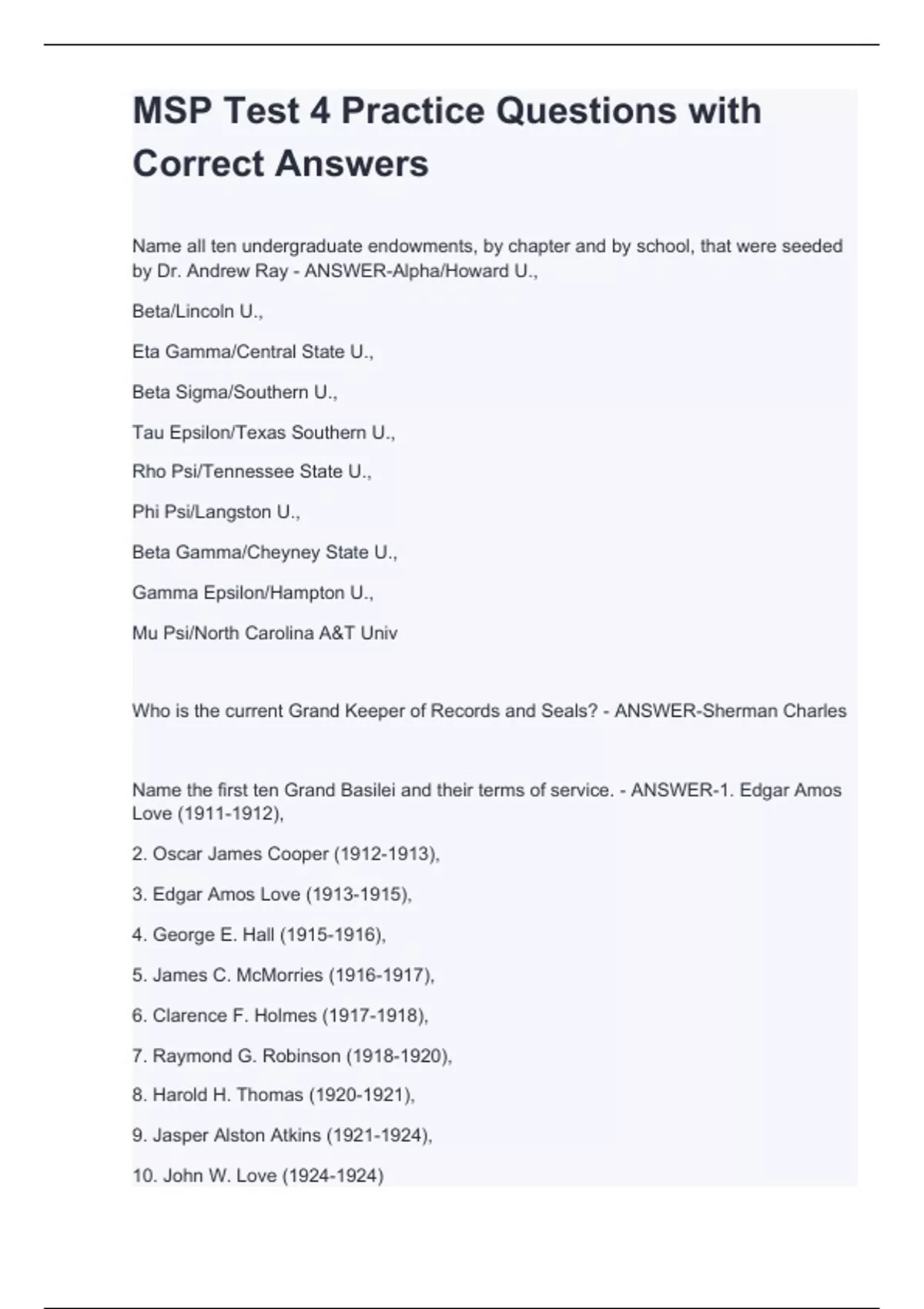 Name all ten undergraduate endowments, by chapter and by school, that were seeded by Dr. Andrew Ray - ANSWER-Alpha/Howard U., Beta/Lincoln U., Eta Gamma/Central State U., Beta Sigma/Southern U., Tau Epsilon/Texas Southern U., Rho Psi/Tennessee State U., Phi Psi/Langston U., Beta Gamma/Cheyney State U., Gamma Epsilon/Hampton U., Mu Psi/North Carolina A&T Univ Who is the current Grand Keeper of Records and Seals? - ANSWER-Sherman Charles Name the first ten Grand Basilei and their terms of service. - ANSWER-1. Edgar Amos Love (), 2. Oscar James Cooper (), 3. Edgar Amos Love (), 4. George E. Hall (), 5. James C. McMorries (), 6. Clarence F. Holmes (), 7. Raymond G. Robinson (), 8. Harold H. Thomas (), 9. Jasper Alston Atkins (), 10. John W. Love ()