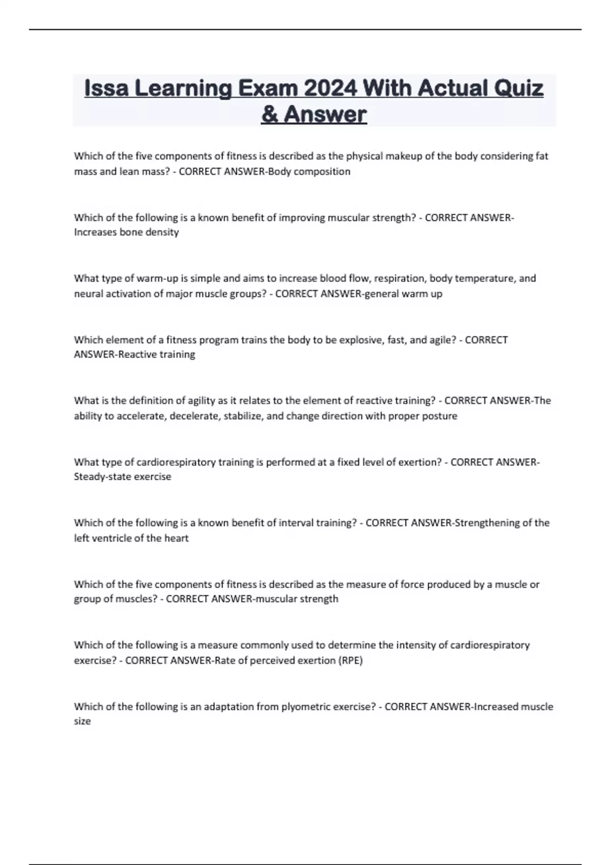 Issa Learning Exam 2024 With Actual Quiz & Answer Which of the five components of fitness is described as the physical makeup of the body considering fat mass and lean mass? - CORRECT ANSWER-Body composition Which of the following is a known benefit of improving muscular strength? - CORRECT ANSWERIncreases bone density What type of warm-up is simple and aims to increase blood flow, respiration, body temperature, and neural activation of major muscle groups? - CORRECT ANSWER-general warm up Which element of a fitness program trains the body to be explosive, fast, and agile? - CORRECT ANSWER-Reactive training