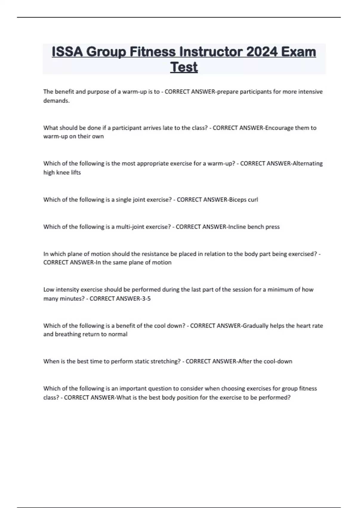 ISSA Group Fitness Instructor 2024 Exam Test The benefit and purpose of a warm-up is to - CORRECT ANSWER-prepare participants for more intensive demands. What should be done if a participant arrives late to the class? - CORRECT ANSWER-Encourage them to warm-up on their own Which of the following is the most appropriate exercise for a warm-up? - CORRECT ANSWER-Alternating high knee lifts Which of the following is a single joint exercise? - CORRECT ANSWER-Biceps cur