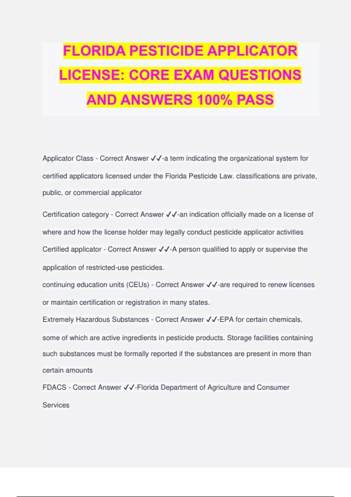 FLORIDA PESTICIDE APPLICATOR LICENSE: CORE EXAM QUESTIONS AND ANSWERS 100% PASS Applicator Class - Correct Answer ️️ -a term indicating the organizational system for certified applicators licensed under the Florida Pesticide Law. classifications are private, public, or commercial applicator Certification category - Correct Answer ️️ -an indication officially made on a license of where and how the license holder may legally conduct pesticide applicator activities Certified applicator - Correct Answer ️️ -A person qualified to apply or supervise the application of restricted-use pesticides. continuing education units (CEUs) - Correct Answer ️️ -are required to renew licenses or maintain certification or registration in many states. Extremely Hazardous Substances - Correct Answer ️️ -EPA for certain chemicals, some of which are active ingredients in pesticide products. Storage facilities containing such substances must be formally reported if the substances are present in more than certain amounts FDACS - Correct Answer ️️ -Florida Department of Agriculture and Consumer Services FIFRA - Correct Answer ️️ -Federal insecticide, fungicide, and rodenticide act- federal laws that provide the overall frame work for the federal pesticide program Florida pesticide law - Correct Answer ️️ -the law that governs the use of pesticides in Florida, which is administered by the Florida Department of Agricultural and Consumer Services (FDACS) Limited certification - Correct Answer ️️ -a designation on a license issued under the structural pest control act that enables the license issued to apply pesticides only under certain prescribed circumstances Ordinance - Correct Answer ️️ -laws developed by local government officials; ordinances are enforced at the city or county government level recertification - Correct Answer ️️ -the process by which licensed pesticide