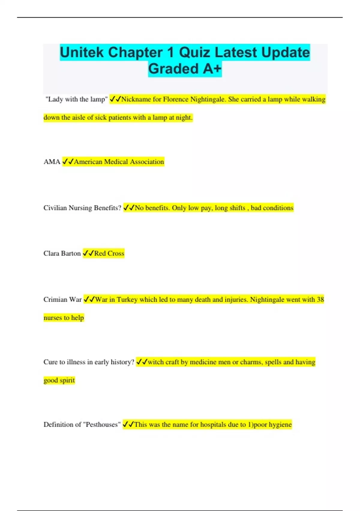Unitek Chapter 1 Quiz Latest Update Graded A+ "Lady with the lamp" Nickname for Florence Nightingale. She carried a lamp while walking down the aisle of sick patients with a lamp at night. AMA American Medical Association Civilian Nursing Benefits? No benefits. Only low pay, long shifts , bad conditions Clara Barton Red Cross Crimian War War in Turkey which led to many death and injuries. Nightingale went with 38 nurses to help Cure to illness in early history? witch craft by medicine men or charms, spells and having good spirit Definition of "Pesthouses" This was the name for hospitals due to 1)poor hygiene 2)unchecked infections 3) dirty physical conditions Dorothea Dix Superintendent of Female Nurses of the Union Army First states to mandate license New Jersey, New York, North Carolina, Virginia Florence Nightingale 1st Nursing theorist. attended nursing school in 1851 at Kaiserwerth. superintendent of ill governess How did Nightingale Nurses improve patient care by? Good hygiene, patient observation, accurate information keeping, nutritional improvement,