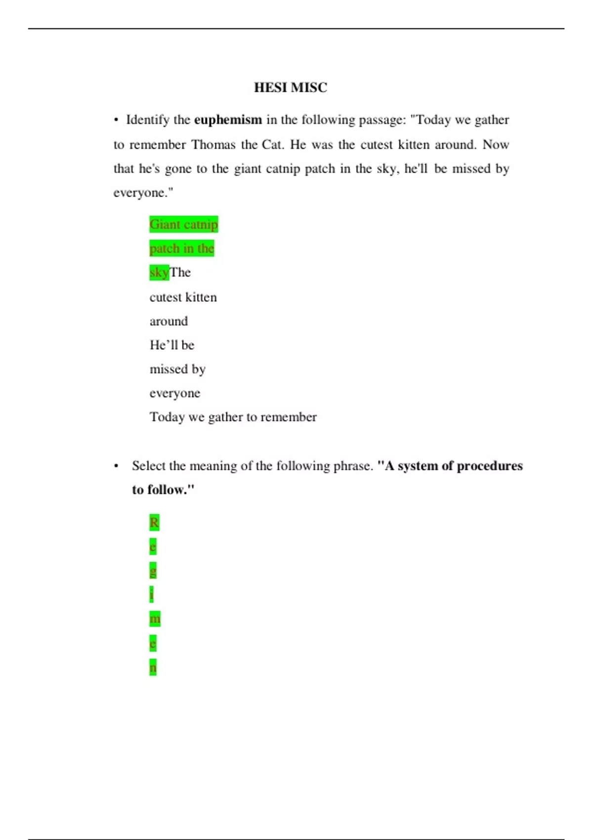 • Identify the euphemism in the following passage: "Today we gather to remember Thomas the Cat. He was the cutest kitten around. Now that he's gone to the giant catnip patch in the sky, he'll be missed by everyone." Giant catnip patch in the skyThe cutest kitten around He’ll be missed by everyone Today we gather to remember • Select the meaning of the following phrase. "A system of procedures to follow." R e g i m e n RegimeTestamentTreatment • Select the word that best fits the sentence. The student was not well liked by hispeers. G e n i a l i t y A f f a b l y G r e g a r i o u s D e t e s t a b l e • An apartment is advertised as being furnished. What does the sentence mean?It is equipped with articles It has just been repainted The first month’s rent must be paid in advanceThe utility bills are included in the rental cost • Select the meaning of the quoted word in the sentence. The client appeared to be 'impervious' to pain