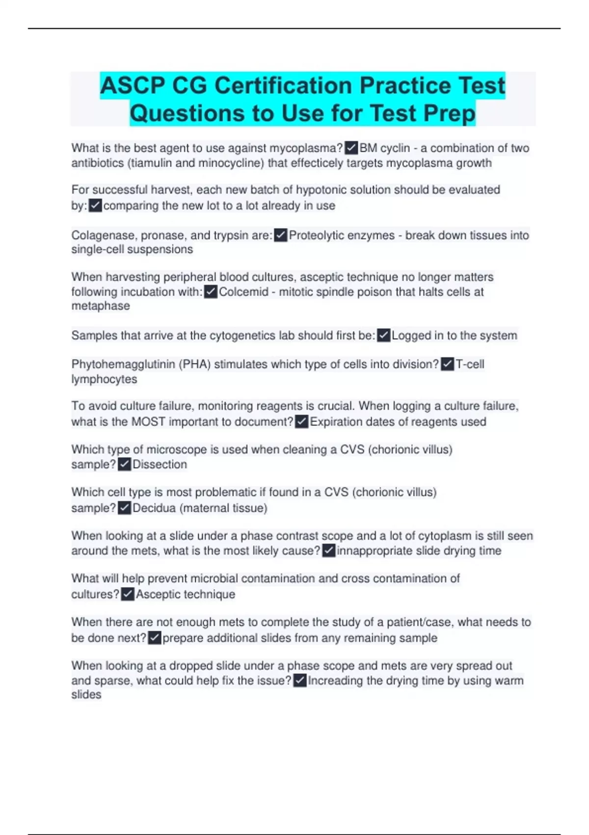 What is the best agent to use against mycoplasma?BM cyclin - a combination of two antibiotics (tiamulin and minocycline) that effecticely targets mycoplasma growth For successful harvest, each new batch of hypotonic solution should be evaluated by:comparing the new lot to a lot already in use Colagenase, pronase, and trypsin are:Proteolytic enzymes - break down tissues into single-cell suspensions When harvesting peripheral blood cultures, asceptic technique no longer matters following incubation with:Colcemid - mitotic spindle poison that halts cells at metaphase Samples that arrive at the cytogenetics lab should first be:Logged in to the system Phytohemagglutinin (PHA) stimulates which type of cells into division?T-cell lymphocytes To avoid culture failure, monitoring reagents is crucial. When logging a culture failure, what is the MOST important to document?Expiration dates of reagents used Which type of microscope is used when cleaning a CVS (chorionic villus) sample?Dissection Which cell type is most problematic if found in a CVS (chorionic villus) sample?Decidua (maternal tissue) When looking at a slide under a phase contrast scope and a lot of cytoplasm is still seen around the mets, what is the most likely cause?innappropriate slide drying time What will help prevent microbial contamination and cross contamination of cultures?Asceptic technique When there are not enough mets to complete the study of a patient/case, what needs to be done next?prepare additional slides from any remaining sample When looking at a dropped slide under a phase scope and mets are very spread out and sparse, what could help fix the issue?Increading the drying time by using warm slides