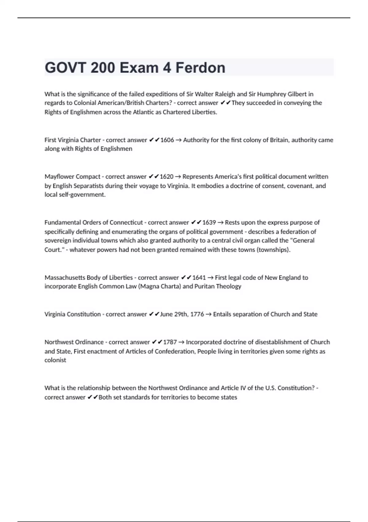 GOVT 200 Exam 4 What is the significance of the failed expeditions of Sir Walter Raleigh and Sir Humphrey Gilbert in regards to Colonial American/British Charters? - correct answer They succeeded in conveying the Rights of Englishmen across the Atlantic as Chartered Liberties. First Virginia Charter - correct answer 1606 → Authority for the first colony of Britain, authority came along with Rights of Englishmen Mayflower Compact - correct answer 1620 → Represents America's first political document written by English Separatists during their voyage to Virginia. It embodies a doctrine of consent, covenant, and local self-government. Fundamental Orders of Connecticut - correct answer 1639 → Rests upon the express purpose of specifically defining and enumerating the organs of political government - describes a federation of sovereign individual towns which also granted authority to a central civil organ called the "General Court." - whatever powers had not been granted remained with these towns (townships). Massachusetts Body of Liberties - correct answer 1641 → First legal code of New England to incorporate English Common Law (Magna Charta) and Puritan Theology Virginia Constitution - correct answer June 29th, 1776 → Entails separation of Church and State Northwest Ordinance - correct answer 1787 → Incorporated doctrine of disestablishment of Church and State, First enactment of Articles of Confederation, People living in territories given some rights as colonist What is the relationship between the Northwest Ordinance and Article IV of the U.S. Constitution? - correct answer Both set standards for territories to become states