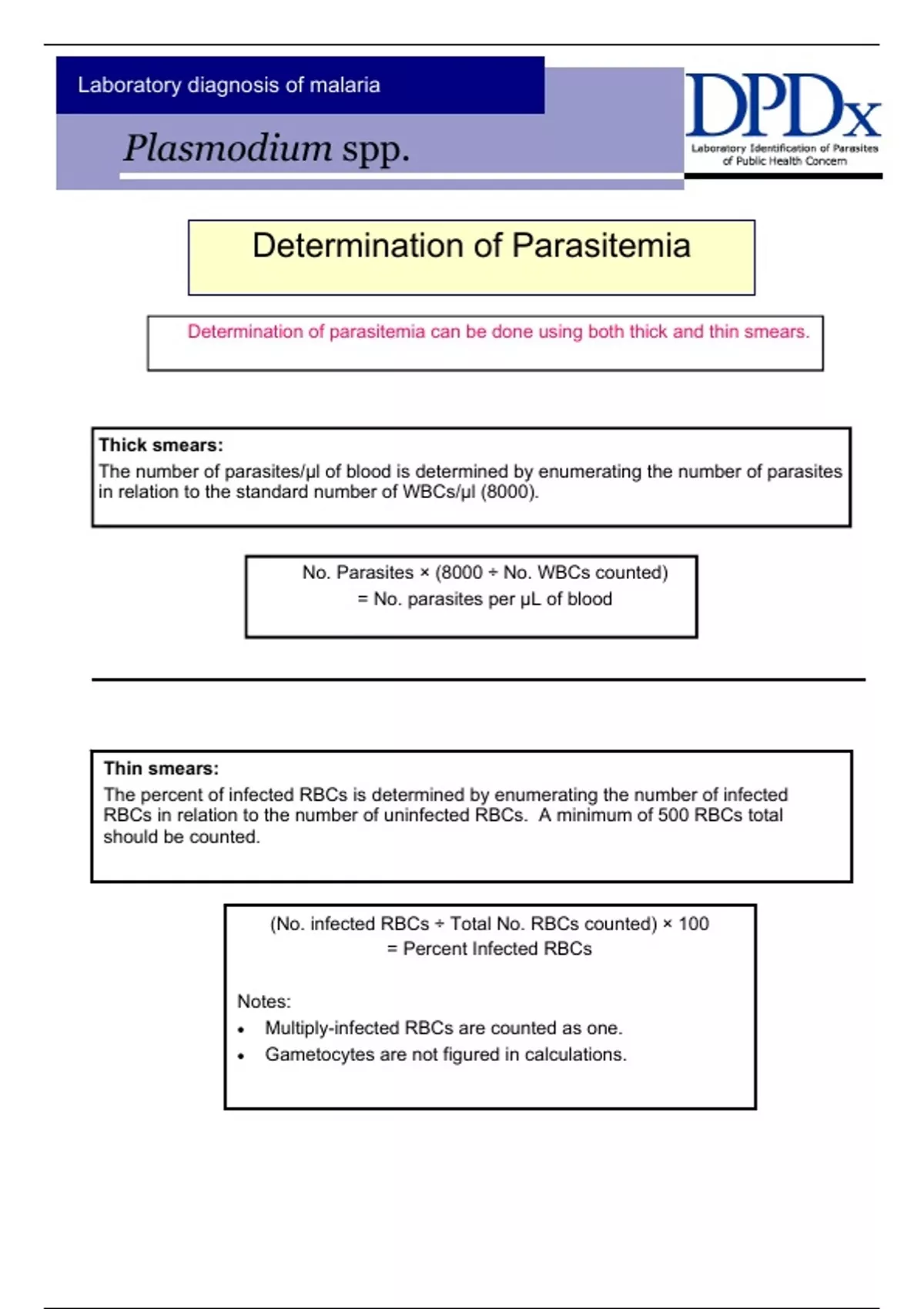 Laboratory diagnosis of malaria Plasmodium spp. Determination of Parasitemia