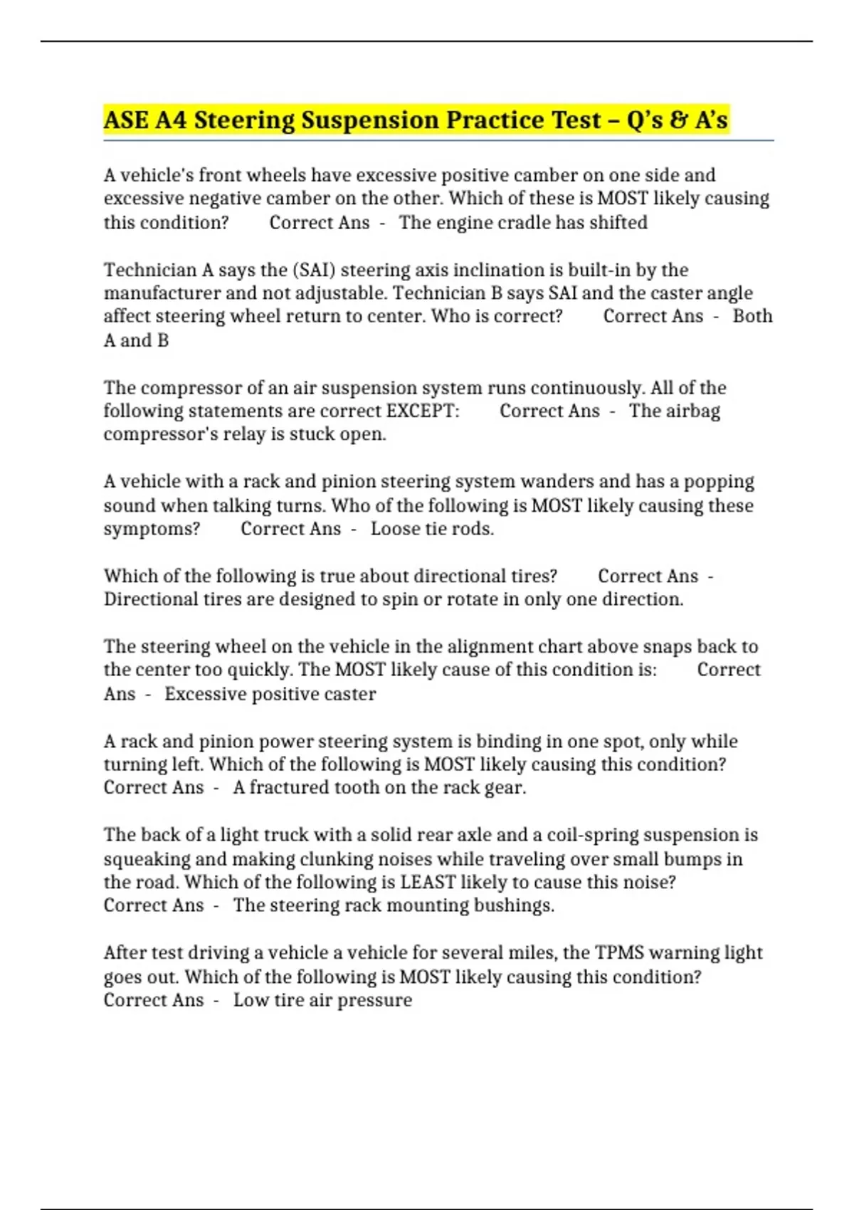 ASE A4 Steering Suspension Practice Test – Q’s & A’s