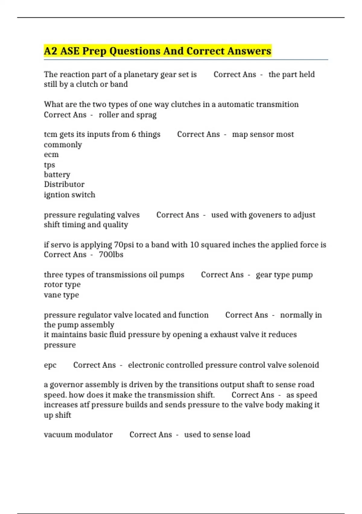 A2 ASE Prep Questions And Correct Answers