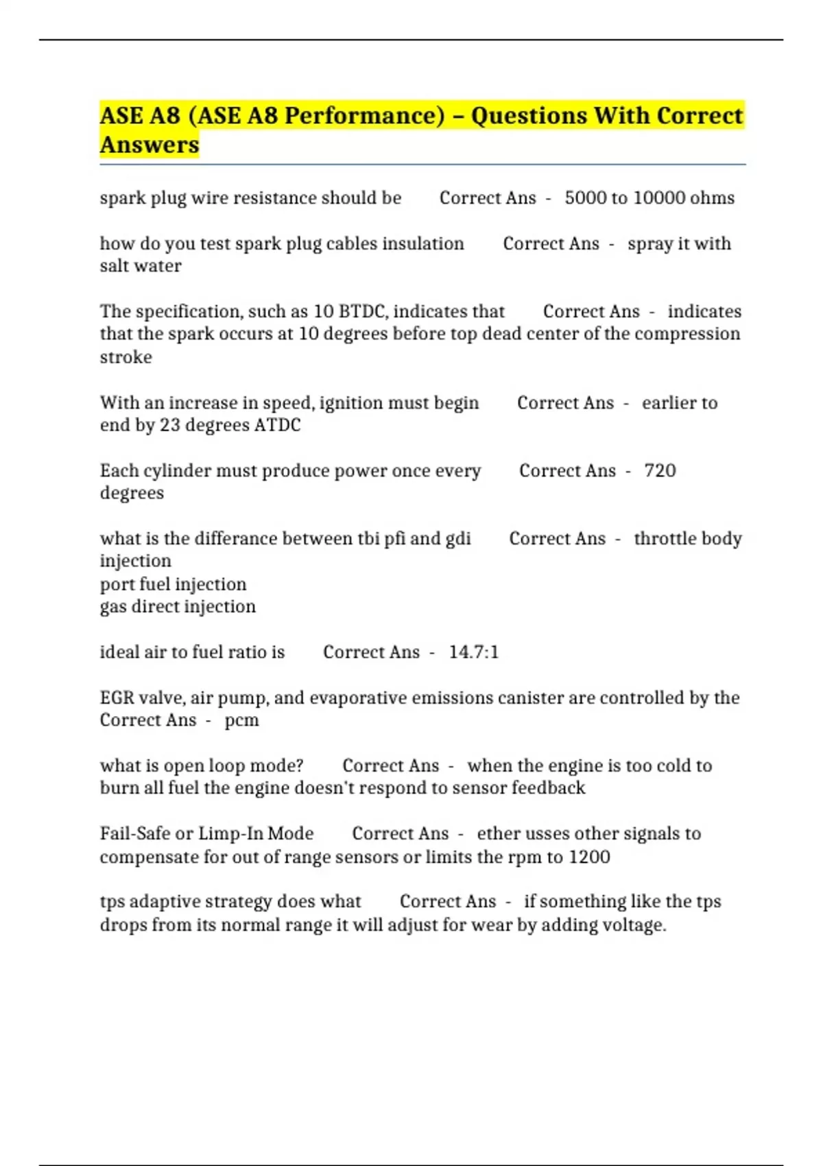 ASE A8 (ASE A8 Performance) – Questions With Correct Answers