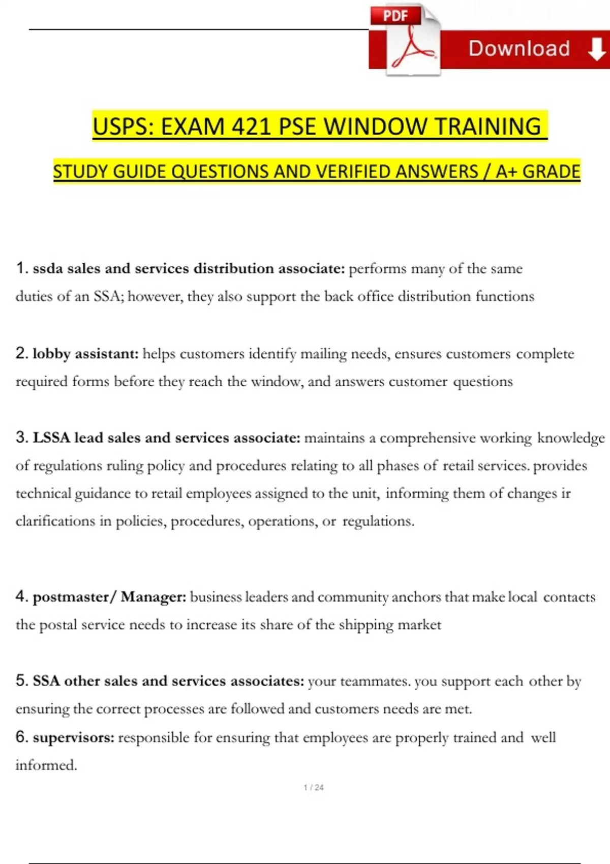 USPS 421 PSE Window Training Test 2024 Study Guide, 400+ Questions & Revised Correct Answers. (2024 / 2025) 100% Guarantee Pass