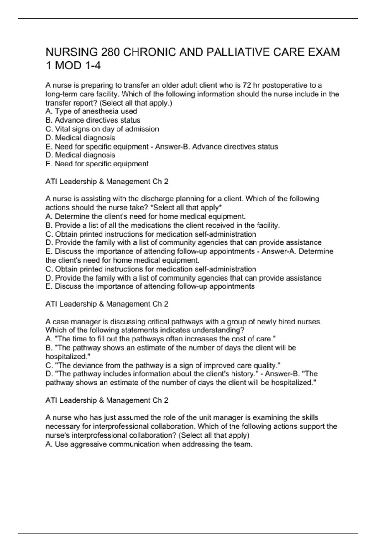 A nurse is preparing to transfer an older adult client who is 72 hr postoperative to a long-term care facility. Which of the following information should the nurse include in the transfer report? (Select all that apply.) A. Type of anesthesia used B. Advance directives status C. Vital signs on day of admission D. Medical diagnosis E. Need for specific equipment - Answer-B. Advance directives status D. Medical diagnosis E. Need for specific equipment ATI Leadership & Management Ch 2 A nurse is assisting with the discharge planning for a client. Which of the following actions should the nurse take? *Select all that apply* A. Determine the client's need for home medical equipment. B. Provide a list of all the medications the client received in the facility. C. Obtain printed instructions for medication self-administration D. Provide the family with a list of community agencies that can provide assistance E. Discuss the importance of attending follow-up appointments - Answer-A. Determine the client's need for home medical equipment. C. Obtain printed instructions for medication self-administration D. Provide the family with a list of community agencies that can provide assistance E. Discuss the importance of attending follow-up appointments ATI Leadership & Management Ch 2 A case manager is discussing critical pathways with a group of newly hired nurses. Which of the following statements indicates understanding? A. "The time to fill out the pathways often increases the cost of care." B. "The pathway shows an estimate of the number of days the client will be hospitalized." C. "The deviance from the pathway is a sign of improved care quality." D. "The pathway includes information about the client's history." - Answer-B. "The pathway shows an estimate of the number of days the client will be hospitalized." ATI Leadership & Management Ch 2 A nurse who has just assumed the role of the unit manager is examining the skills necessary for interprofessional collaboration. Which of the following actions support the nurse's interprofessional collaboration? (Select all that apply) A.