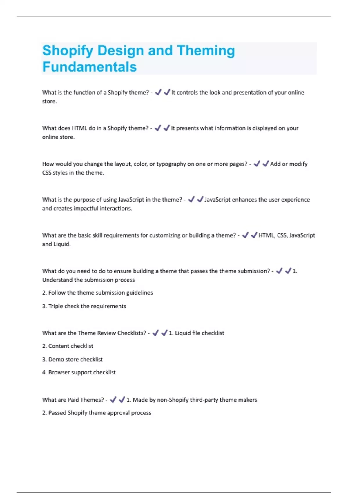 What is the function of a Shopify theme? - It controls the look and presentation of your online store. What does HTML do in a Shopify theme? - It presents what information is displayed on your online store. How would you change the layout, color, or typography on one or more pages? - Add or modify CSS styles in the theme. What is the purpose of using JavaScript in the theme? - JavaScript enhances the user experience and creates impactful interactions. What are the basic skill requirements for customizing or building a theme? - HTML, CSS, JavaScript and Liquid. What do you need to do to ensure building a theme that passes the theme submission? - 1. Understand the submission process 2. Follow the theme submission guidelines 3. Triple check the requirements What are the Theme Review Checklists? - 1. Liquid file checklist 2. Content checklist 3. Demo store checklist 4. Browser support checklist What are Paid Themes? - 1. Made by non-Shopify third-party theme makers 2. Passed Shopify theme approval processWhat are the stages of theme submissions for the Shopify Theme Store? - The product brief, mobile design mockups, and desktop design mockups. Which of the following is not a benefit of listing a theme in the Shopify Theme Store? 1. Priority listing for mobile-friendly themes 2. Exclusivity because of fewer themes overall 3. Higher theme price points 4. Higher theme visibility with merchants - 1. Priority listing for mobile-friendly themes